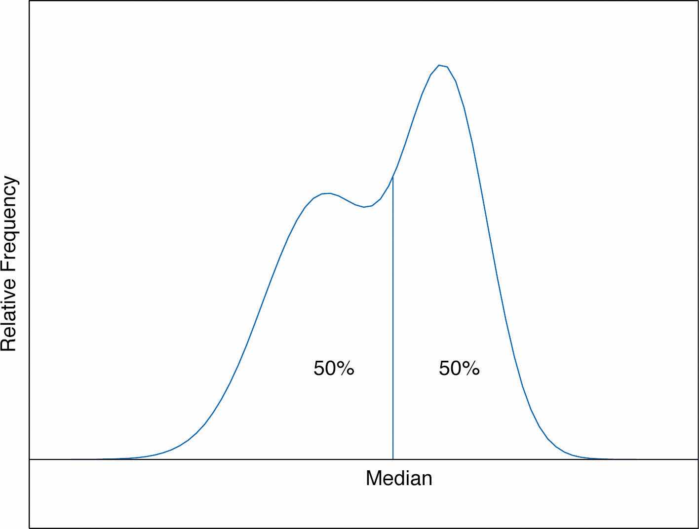 The median is a value that divides the observations in a data set so that 50% of the data are on its left and the other 50% on its right. In accordance with Figure 2.6 "A Very Fine Relative Frequency Histogram", therefore, in the curve that represents the distribution of the data, a vertical line drawn at the median divides the area in two, area 0.5 (50% of the total area 1) to the left and area 0.5 (50% of the total area 1) to the right, as shown in Figure 2.7 "The Median". In our income example the median, $24,600, clearly gave a much better measure of the middle of the data set than did the mean $47,400. This is typical for situations in which the distribution is skewed. (Skewness and symmetry of distributions are discussed at the end of this subsection.)