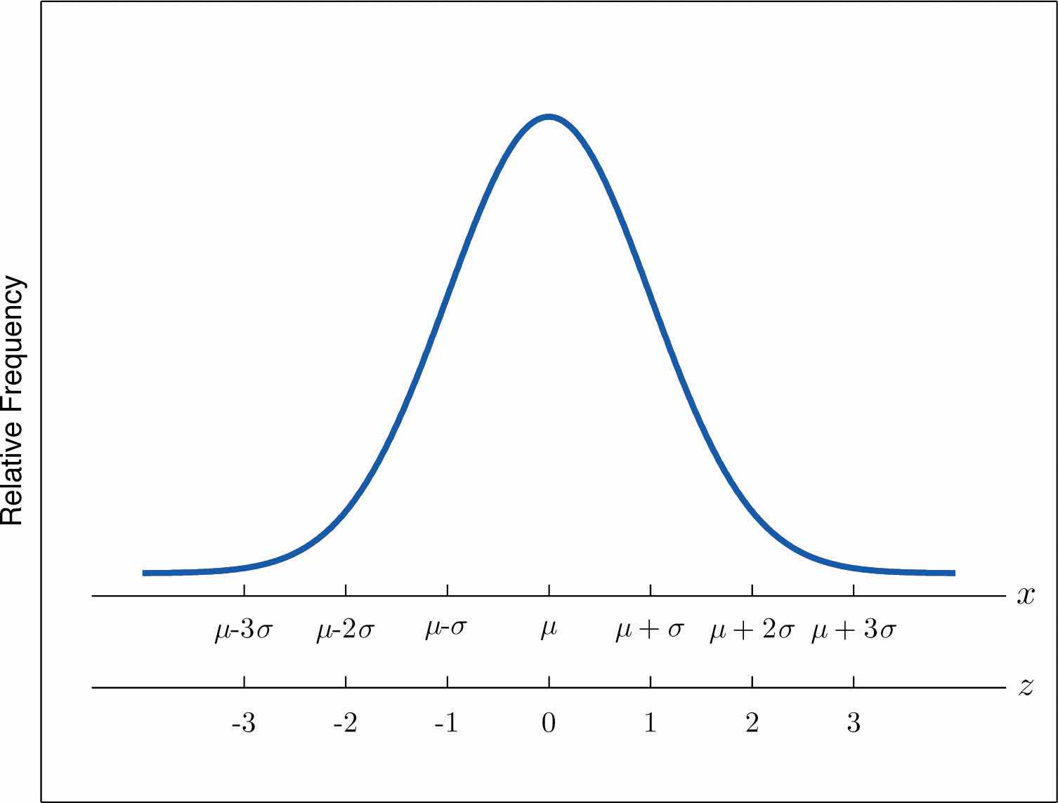 The z-score indicates how many standard deviations an individual observation x is from the center of the data set, its mean. If z is negative then x is below average. If z is 0 then x is equal to the average. If z is positive then x is above average. See Figure 2.14.