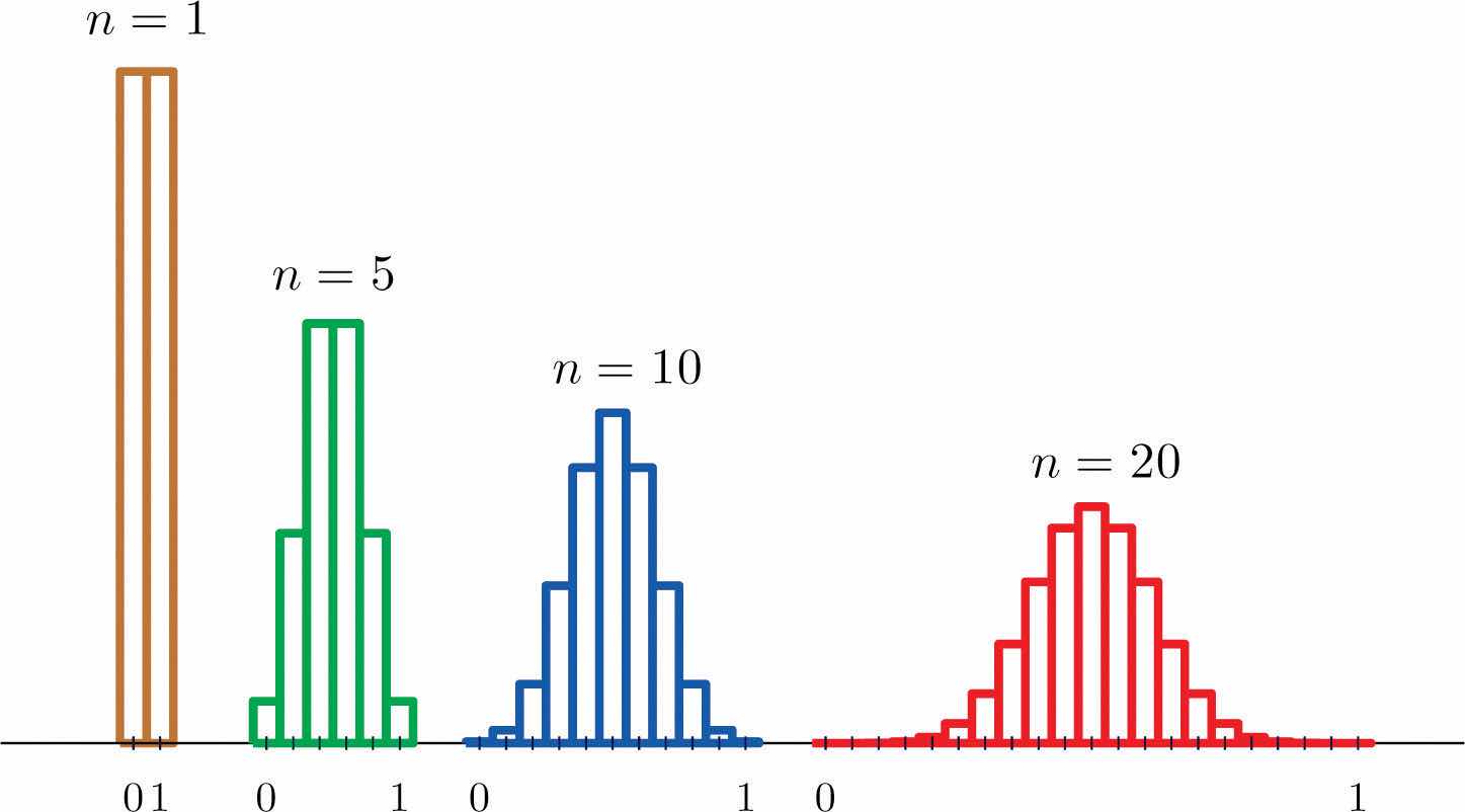 Suppose we take samples of size 1, 5, 10, or 20 from a population that consists entirely of the numbers 0 and 1, half the population 0, half 1, so that the population mean is 0.5. The sampling distributions are: