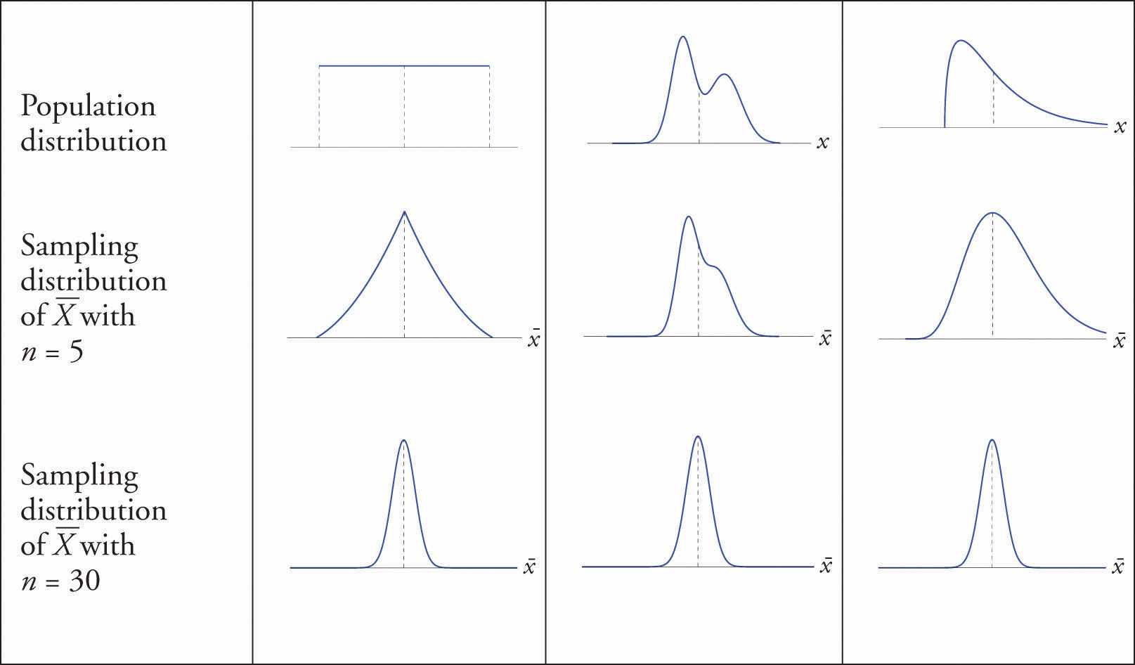The Central Limit Theorem is illustrated for several common population distributions in Figure 6.3 "Distribution of Populations and Sample Means".