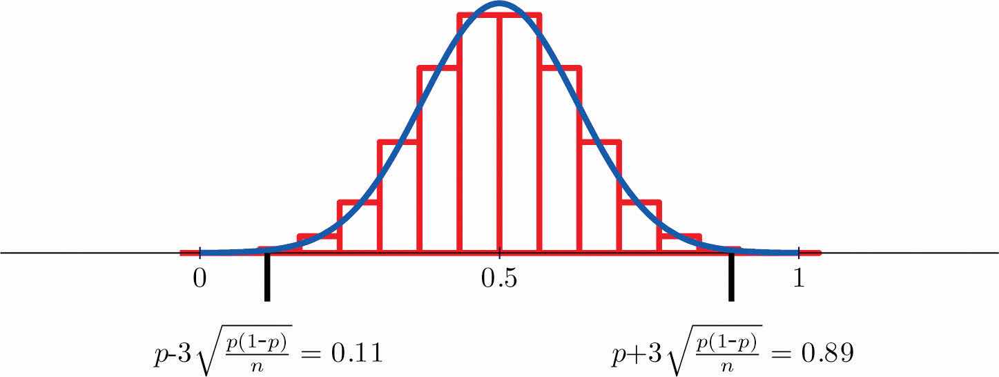 Figure 6.5 "Distribution of Sample Proportions" shows that when p = 0.1 a sample of size 15 is too small but a sample of size 100 is acceptable. Figure 6.6 "Distribution of Sample Proportions for " shows that when p = 0.5 a sample of size 15 is acceptable.