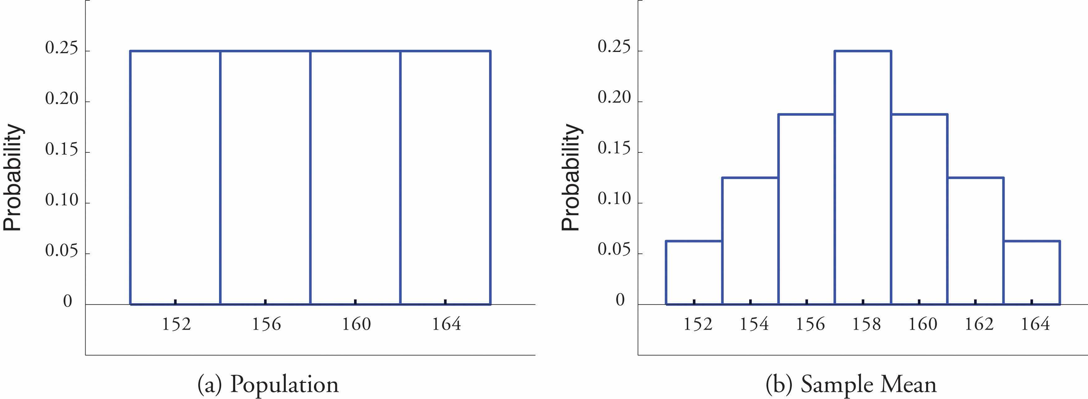 The table shows that there are seven possible values of the sample mean The value happens only one way (the rower weighing 152 pounds must be selected both times), as does the value , but the other values happen more than one way, hence are more likely to be observed than 152 and 164 are. Since the 16 samples are equally likely, we obtain the probability distribution of the sample mean just by counting: