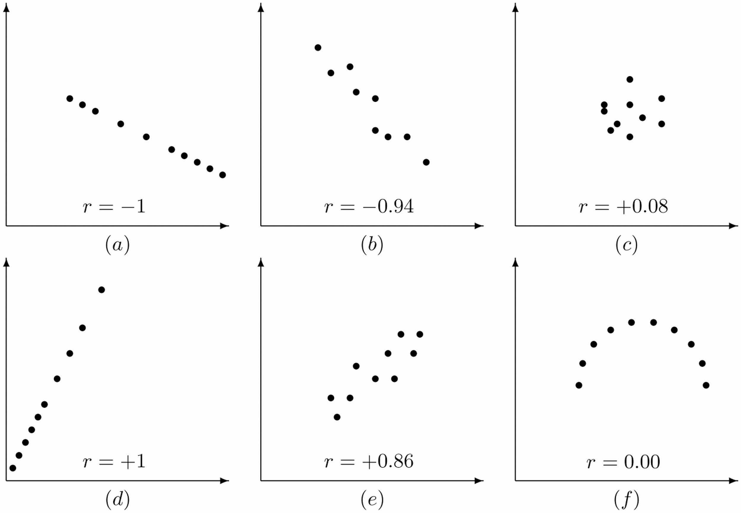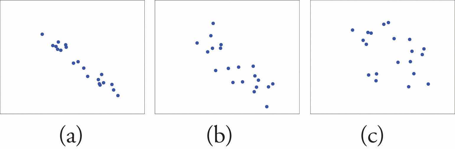 Figure 10.3 "Linear Relationships of Varying Strengths" illustrates linear relationships between two variables x and y of varying strengths. It is visually apparent that in the situation in panel (a), x could serve as a useful predictor of y, it would be less useful in the situation illustrated in panel (b), and in the situation of panel (c) the linear relationship is so weak as to be practically nonexistent. The linear correlation coefficient is a number computed directly from the data that measures the strength of the linear relationship between the two variables x and y.