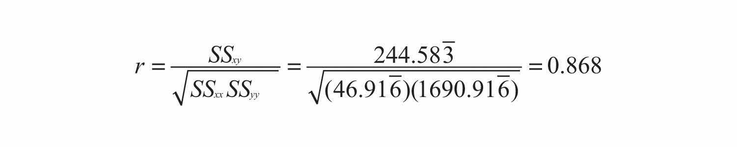 Even for small data sets like this one computations are too long to do completely by hand. In actual practice the data are entered into a calculator or computer and a statistics program is used. In order to clarify the meaning of the formulas we will display the data and related quantities in tabular form. For each pair we compute three numbers: x2, , and y2, as shown in the table provided. In the last line of the table we have the sum of the numbers in each column. Using them we compute: