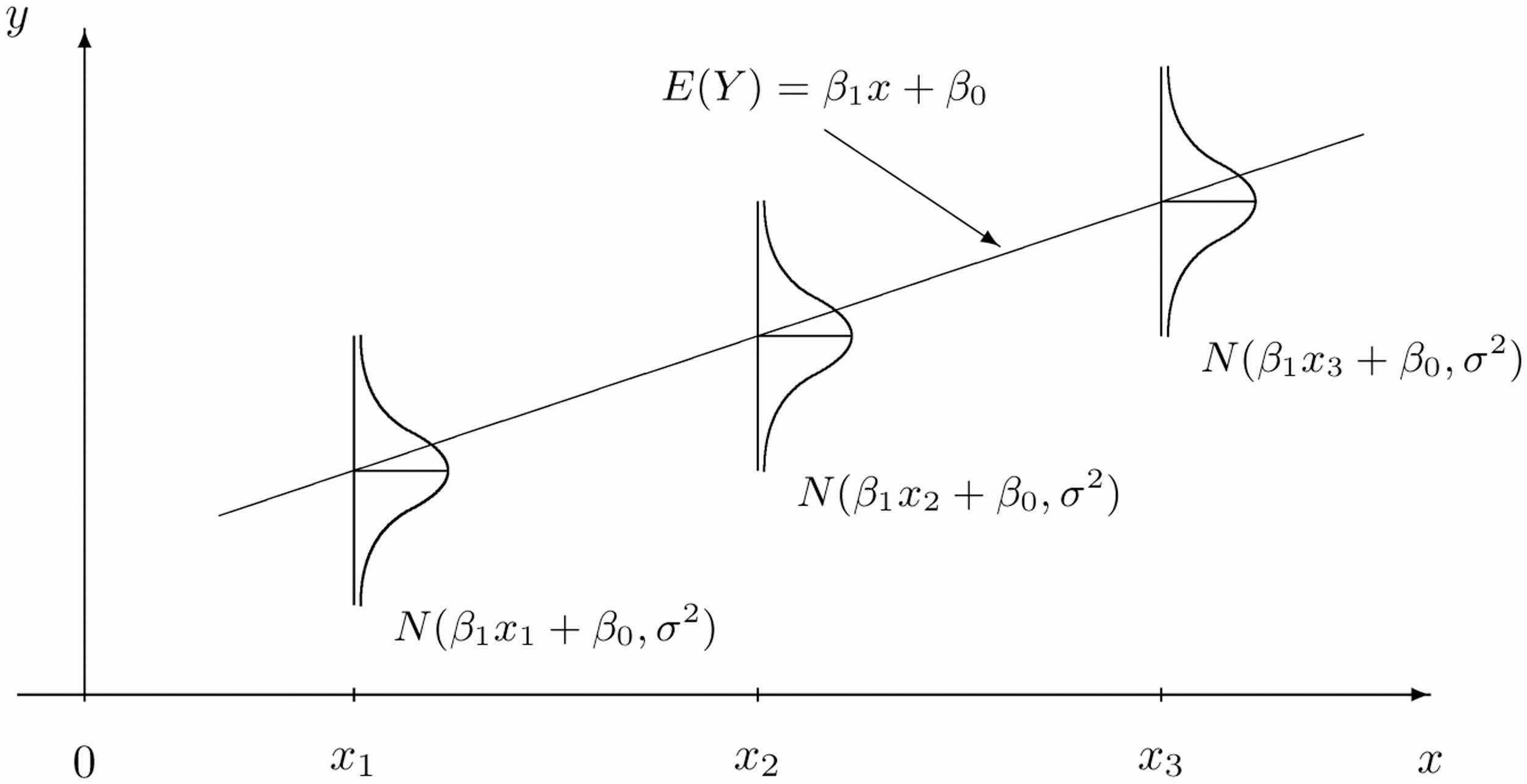 Figure 10.5 "The Simple Linear Model Concept" illustrates the model. The symbols denote a normal distribution with mean μ and variance , hence standard deviation σ.