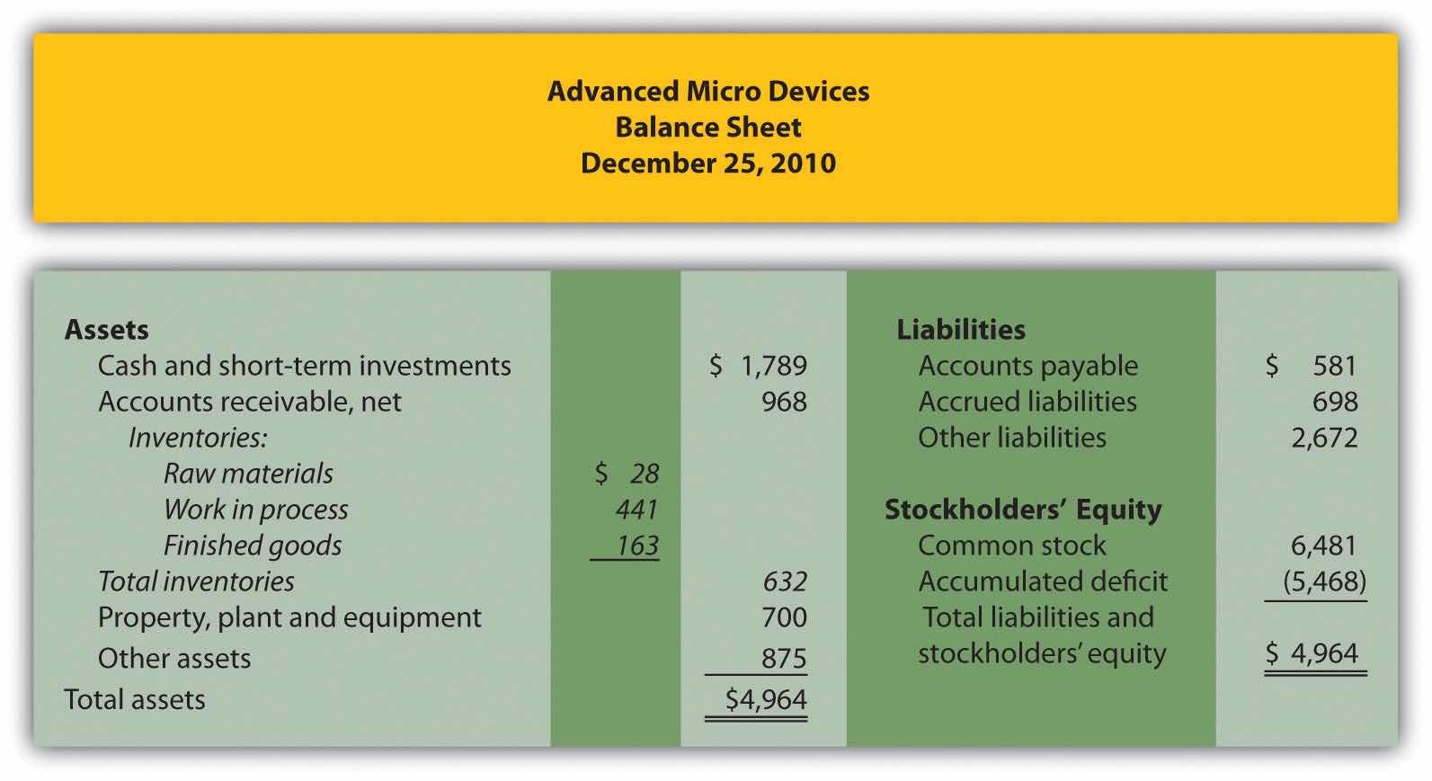 Advanced Micro Devices (AMD), a producer of microprocessors and flash memory devices for personal and networked computers, has annual revenues of $6,500,000,000. A summarized version of AMD’s balance sheet appears as follows (all amounts are in millions). Notice that three inventory accounts, totaling $632,000,000, support the total inventory amount that appears in the asset section of the balance sheet. The raw materials inventory account ($28,000,000) is used to record the cost of materials not yet put into production. The work-in-process inventory account ($441,000,000) is used to record costs associated with microprocessors and flash memory devices in the production process that are not yet complete. The finished goods inventory account ($163,000,000) is used to record the product costs associated with AMD’s products that are completed and ready to sell.