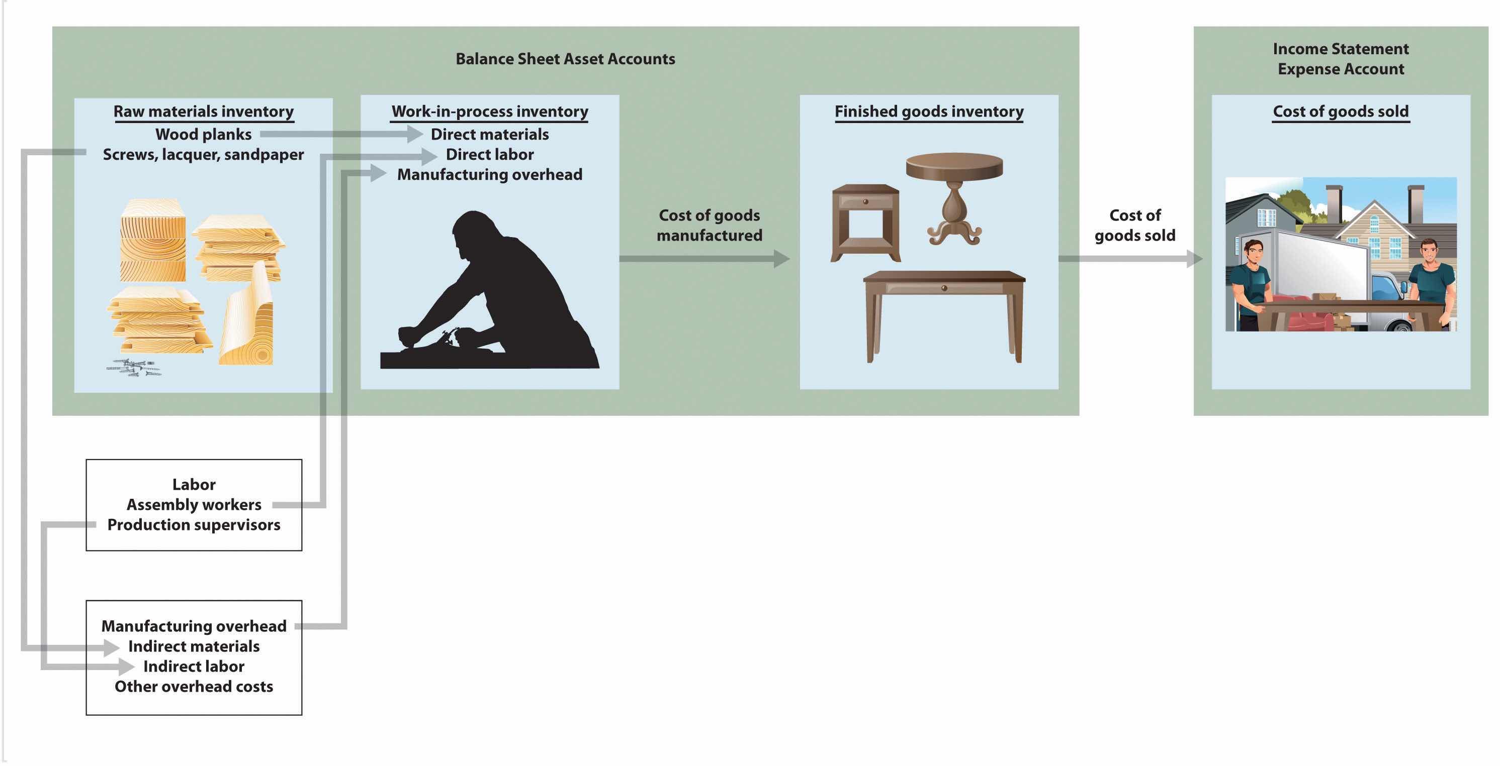 Answer: All the costs mentioned previously for Custom Furniture are product costs (also called manufacturing costs). Product costs are recorded as an asset on the balance sheet until the products are sold, at which point the costs are recorded as an expense on the income statement. To record product costs as an asset, accountants use one of three inventory accounts: raw materials inventory, work-in-process inventory, or finished goods inventory. The account they use depends on the product’s level of completion. They use one expense account—cost of goods sold—to record the product costs when the goods are sold.