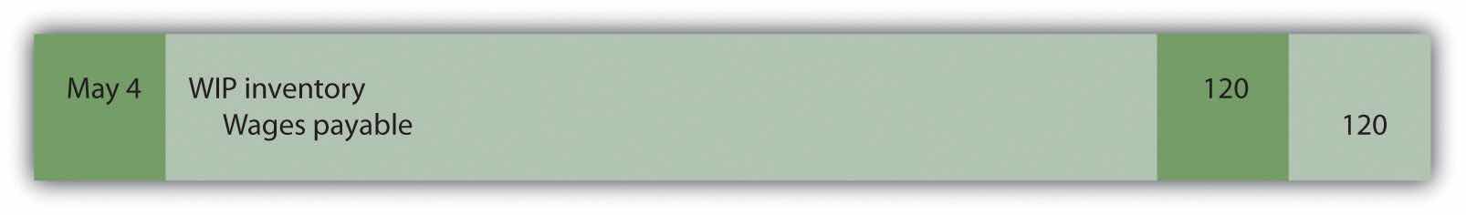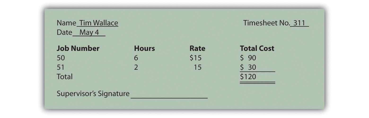 Figure 2.4 "Timesheet for Custom Furniture Company" provides an example of a timesheet used at Custom Furniture Company to track direct labor costs of $120 related to jobs 50 and 51 for Tim Wallace. The journal entry to reflect this is as follows: