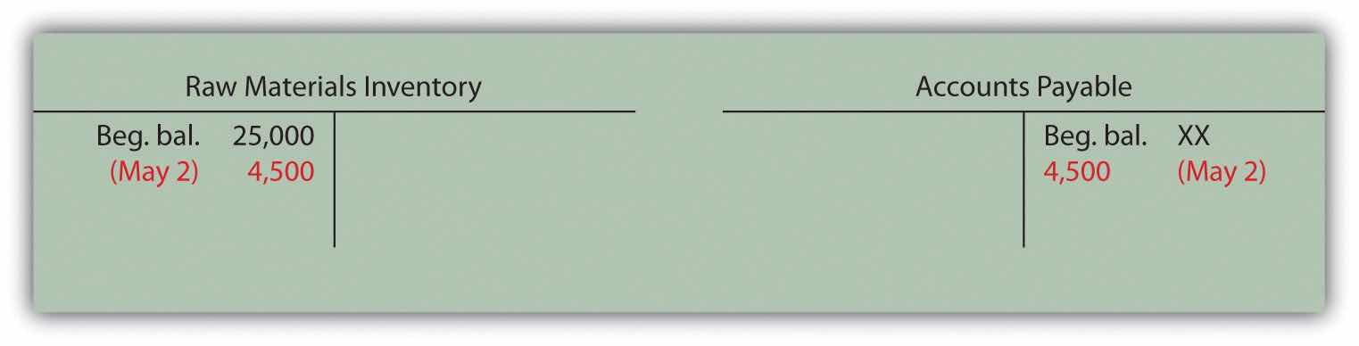 This purchase of raw materials is further illustrated in the T-accounts shown in the following. Assume the beginning balance for raw material inventory is $25,000. Beginning balances are only provided for inventory accounts since the focus of this chapter is on manufacturing costs that flow through these accounts.