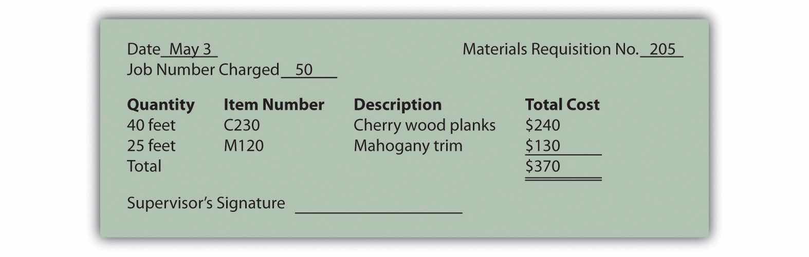 Answer: A materials requisition formA form used to track materials taken out of raw materials inventory and placed into production. tracks materials taken out of raw materials inventory and placed in production. This form specifies the type, quantity, and cost of materials being requested, as well as the number of the job in which the materials will be used. Figure 2.2 "Materials Requisition Form for Custom Furniture Company" shows a materials requisition form that Custom Furniture Company used to transfer $370 in direct materials out of raw materials inventory into production.