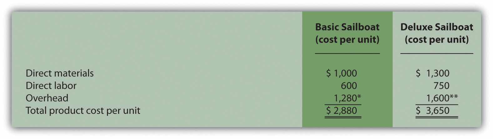 Answer: The calculation of a product’s cost involves three components—direct materials, direct labor, and manufacturing overhead. Assume direct materials cost $1,000 for one unit of the Basic sailboat and $1,300 for the Deluxe. Direct labor costs are $600 for one unit of the Basic sailboat and $750 for the Deluxe. This information, combined with the overhead cost per unit, gives us what we need to determine the product cost per unit for each model.