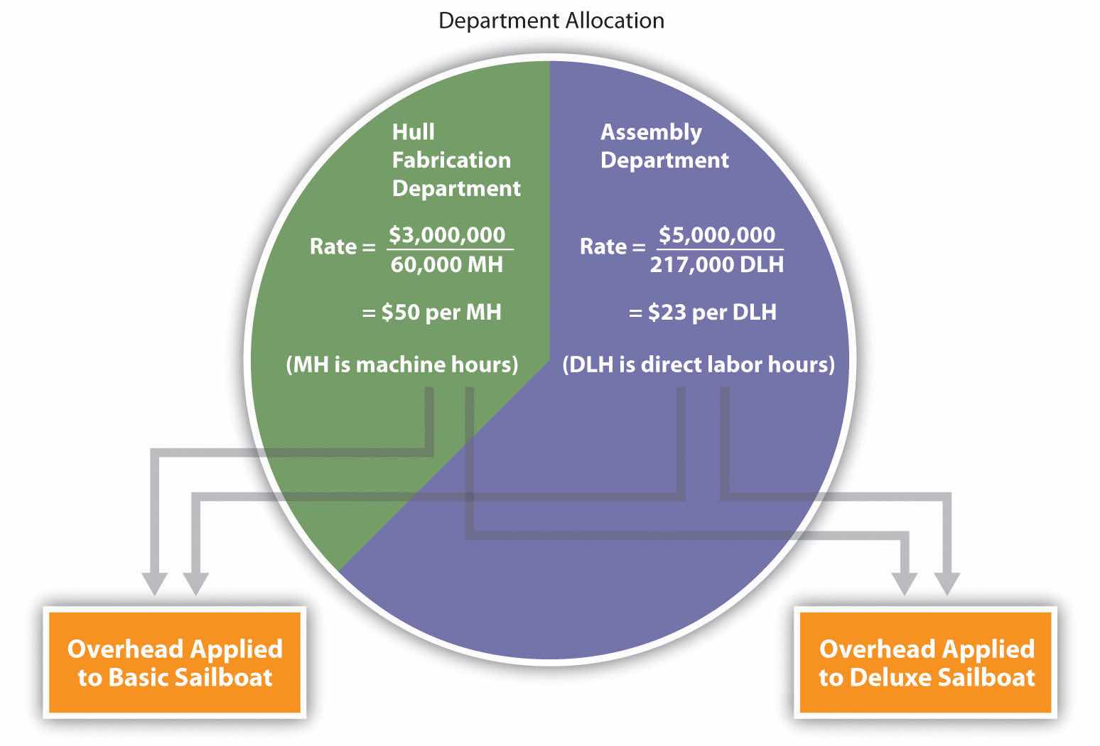 As shown in Figure 3.3 "Using Department Rates to Allocate SailRite Company’s Overhead", products going through the Hull Fabrication department are charged $50 in overhead costs for each machine hour used. Products going through the Assembly department are charged $23 in overhead costs for each direct labor hour used.