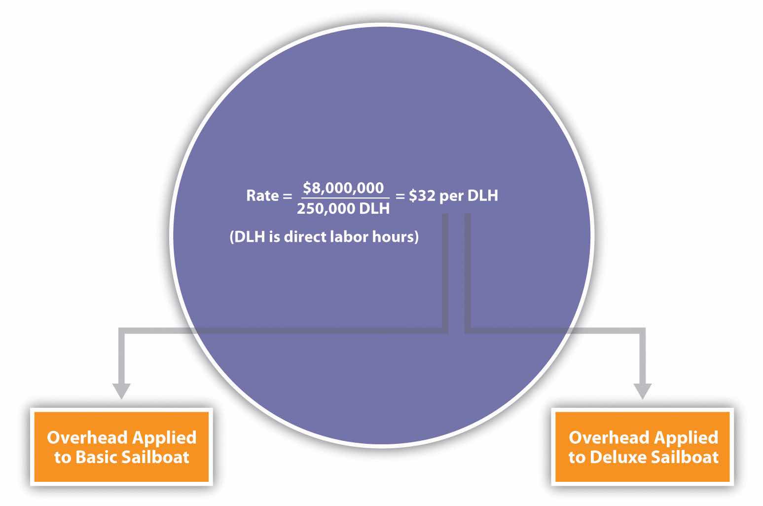 Using SailRite Company as an example, assume annual overhead costs are estimated to be $8,000,000 and direct labor hours are used for the plantwide allocation base. Management estimates that a total of 250,000 direct labor hours are worked annually. These estimates are based on the previous year’s overhead costs and direct labor hours and are adjusted for expected increases in demand the coming year. The predetermined overhead rate is $32 per direct labor hour (= $8,000,000 ÷ 250,000 direct labor hours). Thus, as shown in Figure 3.1 "Using One Plantwide Rate to Allocate SailRite Company’s Overhead", products are charged $32 in overhead costs for each direct labor hour worked.