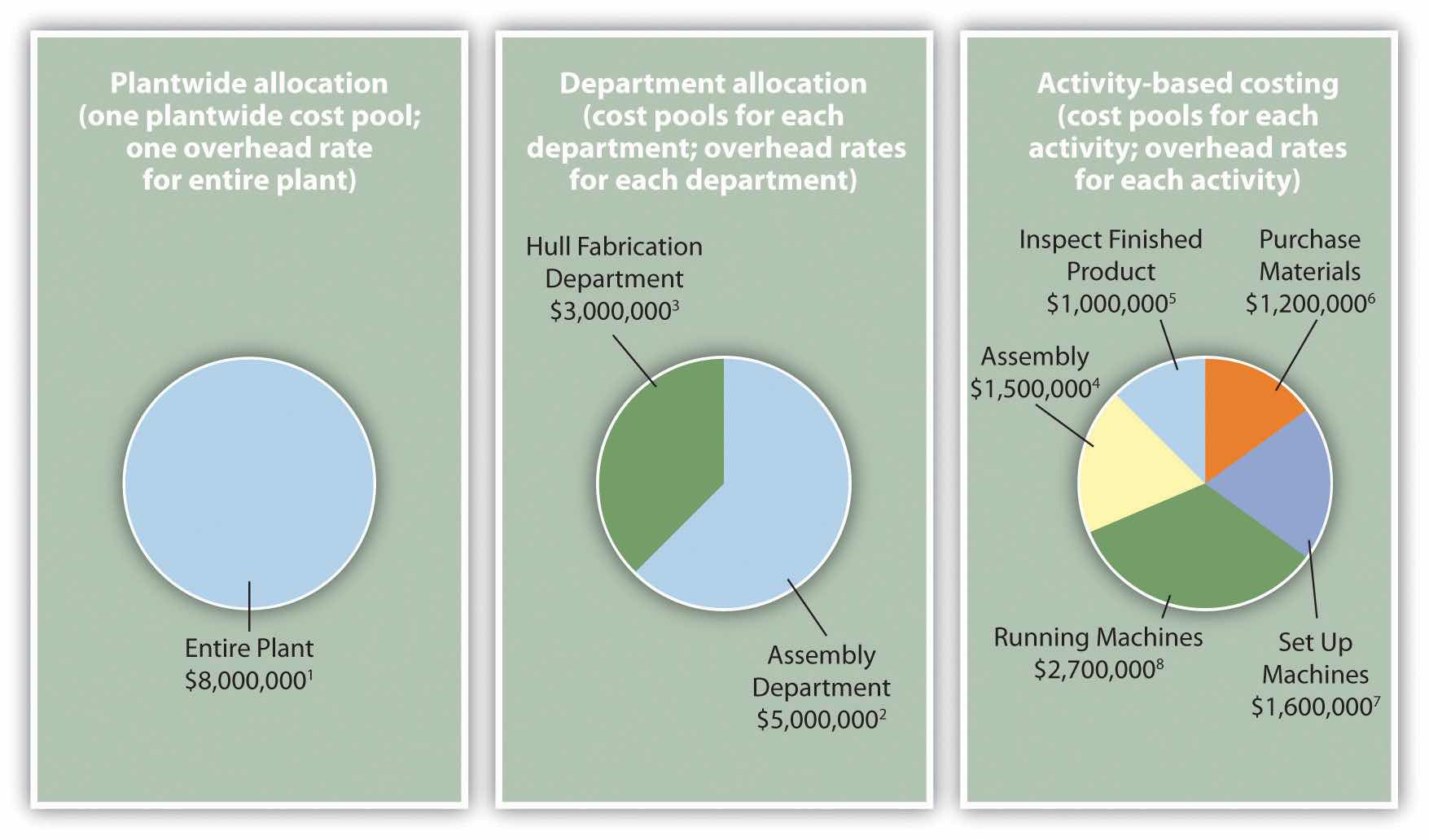 Answer: Activity-based costing (ABC)A method of costing that uses several cost pools, and therefore several predetermined overhead rates, organized by activity to allocate overhead costs. uses several cost pools, organized by activity, to allocate overhead costs. (Remember that plantwide allocation uses one cost pool for the whole plant, and department allocation uses one cost pool for each department.) The idea is that activities are required to produce products—activities such as purchasing materials, setting up machinery, assembling products, and inspecting finished products. These activities can be costly. Thus the cost of activities should be allocated to products based on the products’ use of the activities.