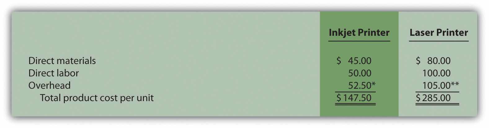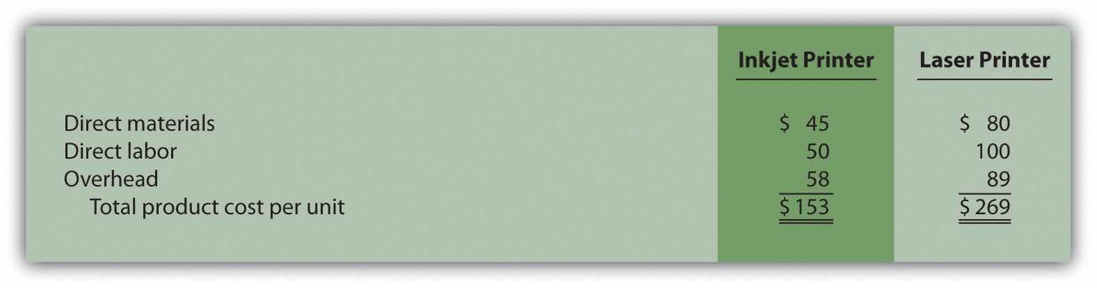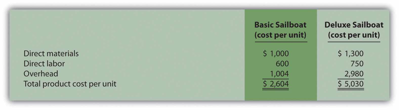 Answer: The calculation of a product’s cost involves three components—direct materials, direct labor, and manufacturing overhead. Assume direct materials cost $1,000 for one unit of the Basic sailboat and $1,300 for the Deluxe. Direct labor costs are $600 for one unit of the Basic sailboat and $750 for the Deluxe. This information, combined with the overhead cost per unit, gives us what we need to determine the product cost per unit for each model.