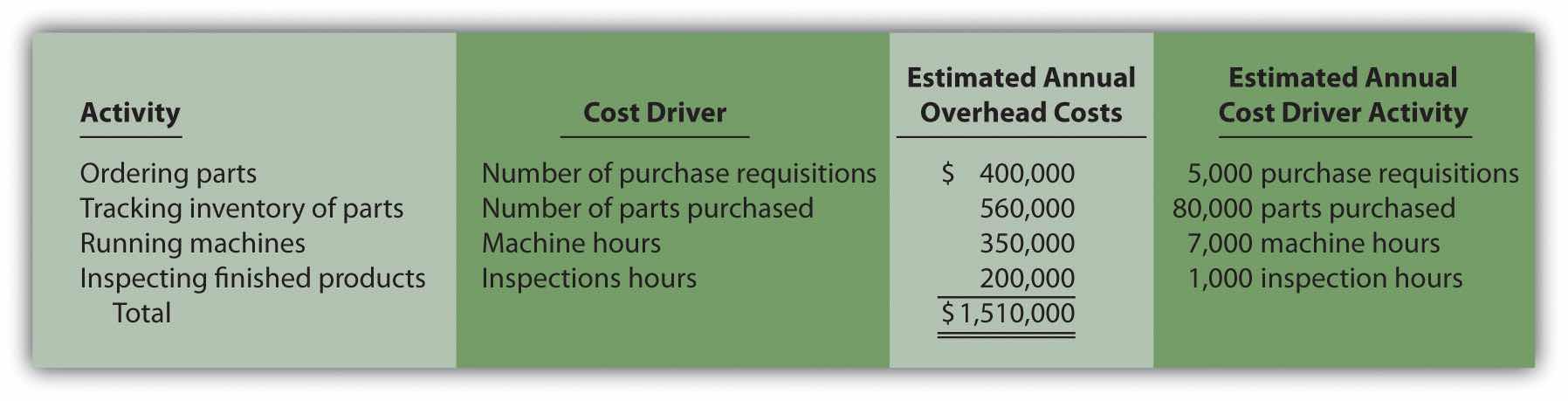 A cost driverThe action that causes the costs associated with an activity. is the action that causes (or “drives”) the costs associated with the activity. Identifying cost drivers requires gathering information and interviewing key personnel in various areas of the organization, such as purchasing, production, quality control, and accounting. After careful scrutiny of the process required for each activity, SailRite established the following cost drivers: