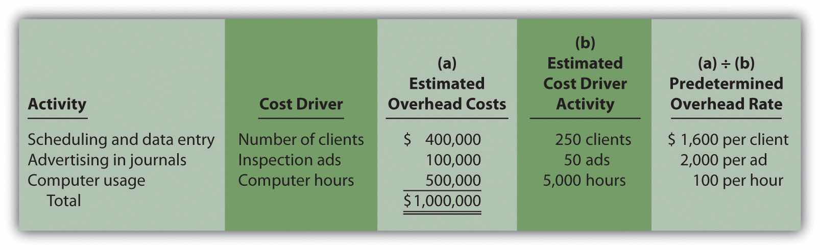 Answer: The plantwide allocationA method of allocating costs that uses one cost pool, and therefore one predetermined overhead rate, to allocate overhead costs. method uses one predetermined overhead rate to allocate overhead costs.Regardless of the approach used to allocate overhead, a predetermined overhead rate is established for each cost pool. The predetermined overhead rate is calculated as follows (from Chapter 2 "How Is Job Costing Used to Track Production Costs?"):When activity-based costing is used, the denominator can also be called estimated cost driver activity. One cost pool accounts for all overhead costs, and therefore one predetermined overhead rate is used to apply overhead costs to products. You learned about this approach in Chapter 2 "How Is Job Costing Used to Track Production Costs?" where one predetermined rate—typically based on direct labor hours, direct labor costs, or machine hours—was used to allocate overhead costs. (Remember, the focus here is on the allocation of overhead costs. Direct materials and direct labor are easily traced to the product and therefore are not a part of the overhead allocation process.)