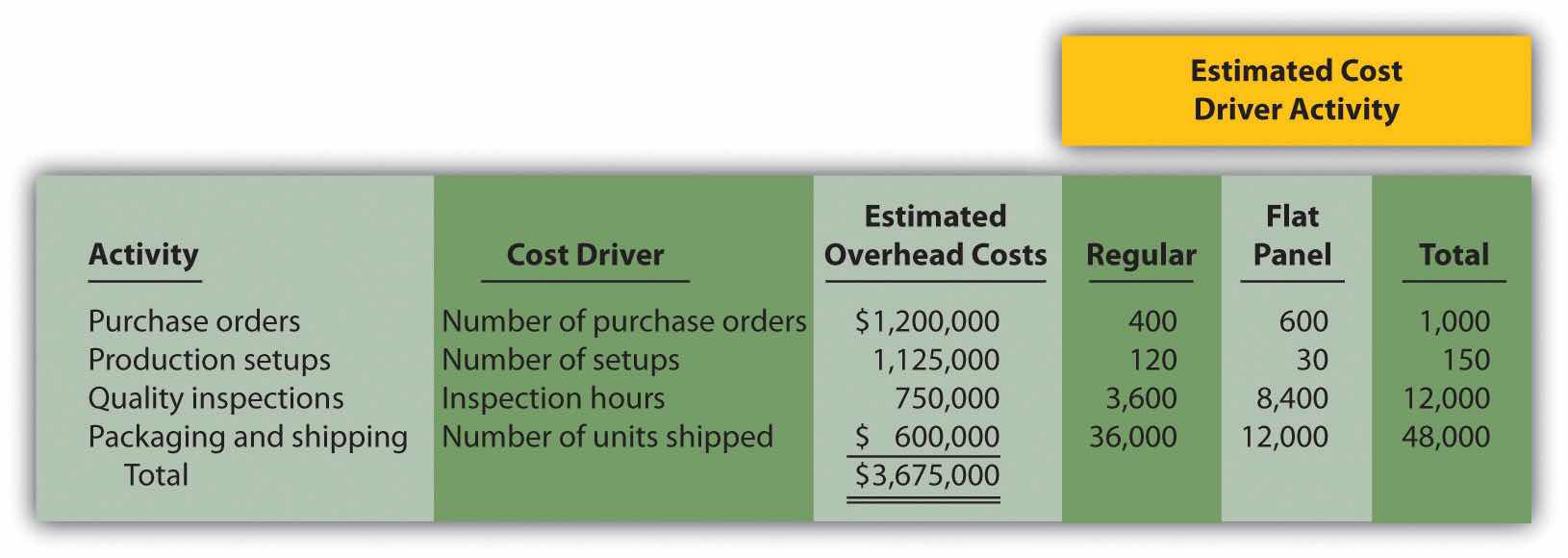 Activity-Based Costing Versus Traditional Approach. Techno Company produces a regular computer monitor that sells for $175 and a flat panel computer monitor that sells for $300. Last year, total overhead costs of $3,675,000 were allocated based on direct labor hours. A total of 63,000 direct labor hours were required last year to build 36,000 regular monitors (1.75 hours per unit), and 42,000 direct labor hours were required to build 12,000 flat panel monitors (3.50 hours per unit). Total direct labor and direct materials costs for last year were as follows: