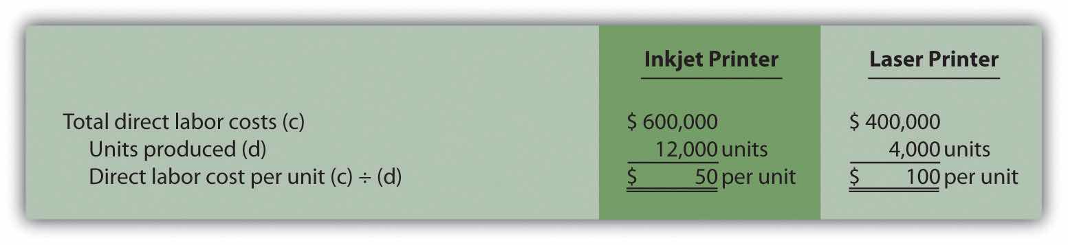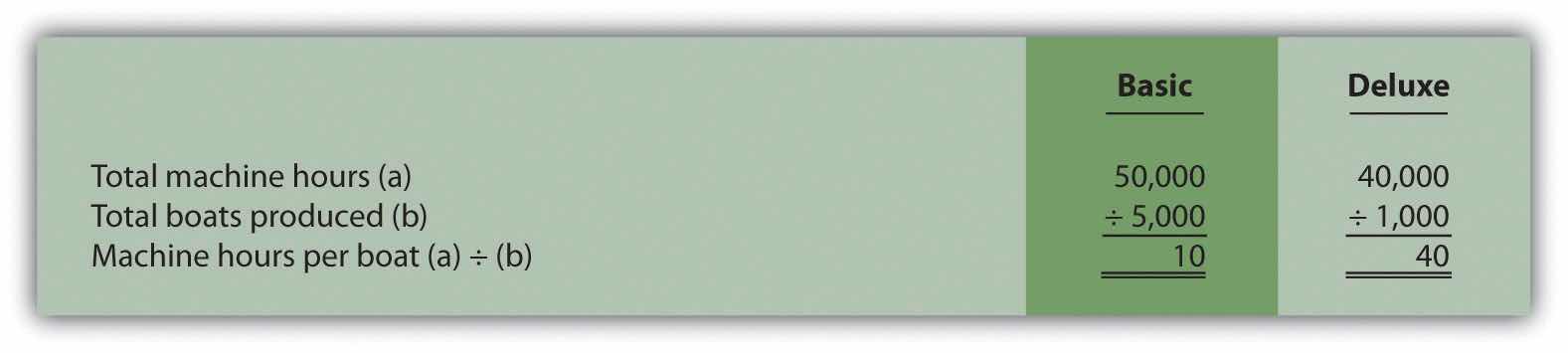 Recall that overhead costs totaled $8,000,000. A total of 90,000 machine hours were used for the period: 50,000 for Basic sailboats and 40,000 for Deluxe sailboats. The company produced 5,000 units of the Basic model and 1,000 units of the Deluxe model. Thus the Basic model uses 10 machine hours per unit (= 50,000 machine hours ÷ 5,000 units) and the Deluxe model uses 40 machine hours per unit (= 40,000 machine hours ÷ 1,000 units).