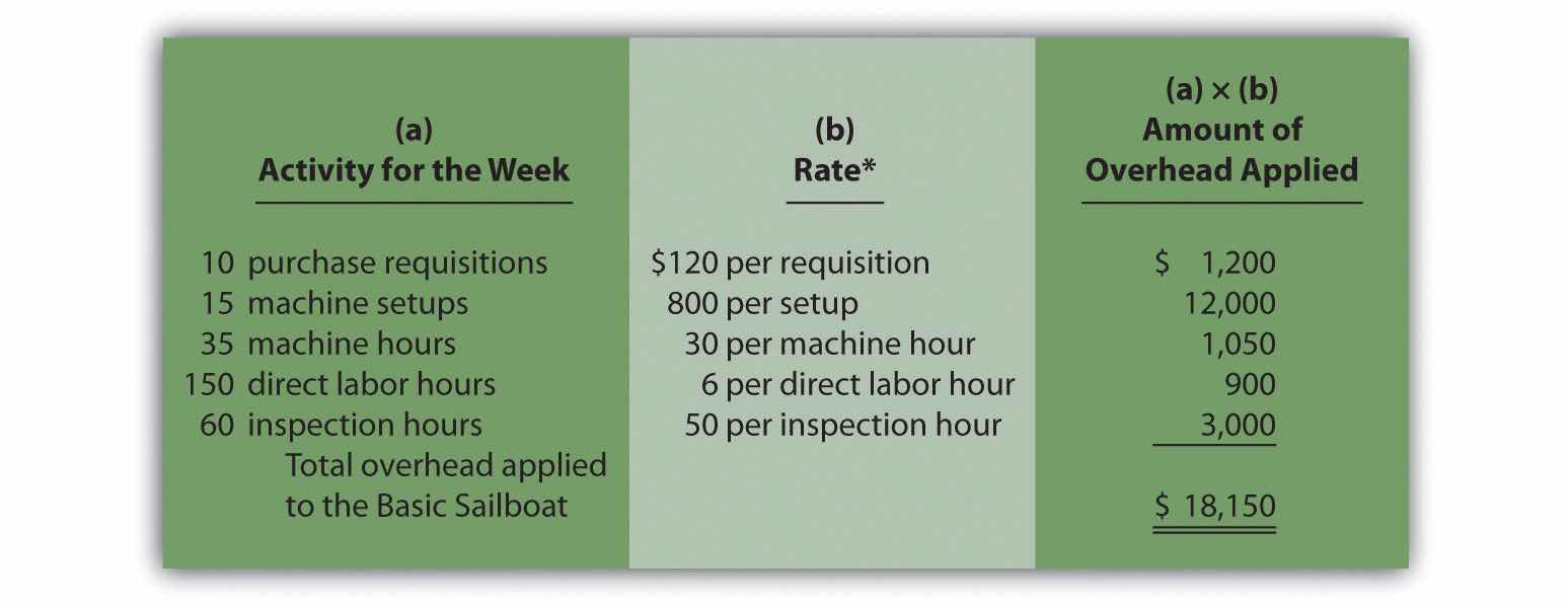 This is done by dividing the estimated overhead costs (from step 2) by the estimated level of cost driver activity (from step 3). Figure 3.4 "Predetermined Overhead Rates for SailRite Company" provides the overhead rate calculations for SailRite Company based on the information shown in the previous three steps. It shows that products will be charged $120 in overhead costs for each purchase requisition processed, $800 for each machine setup, $30 for each machine hour used, $6 for each direct labor hour worked, and $50 for each hour of inspection time.