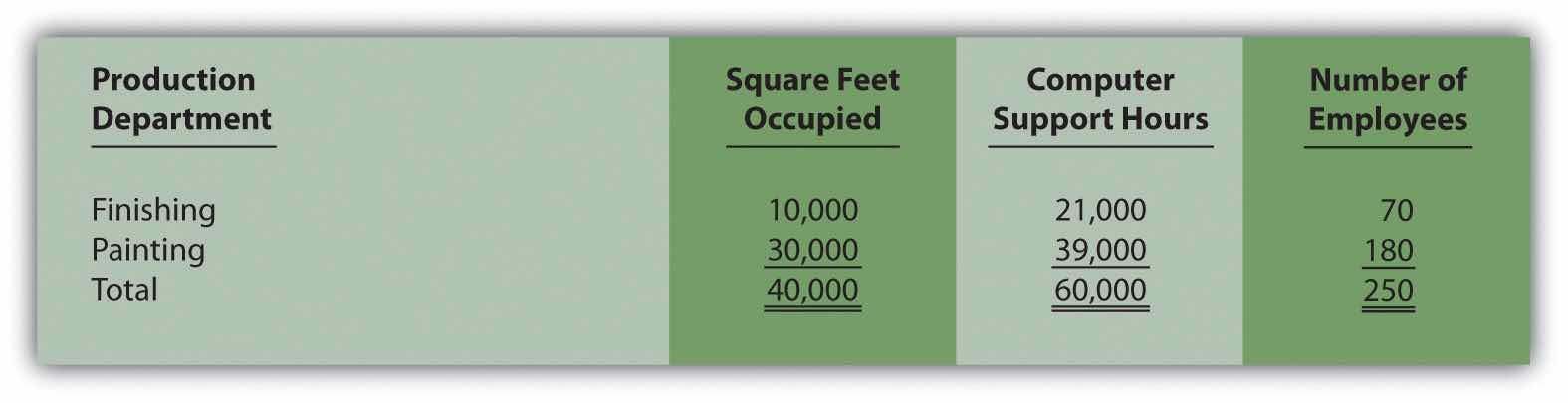 Allocating Service Department Costs. Szabo Industries has two production departments (Finishing and Painting) and three service departments (Maintenance, Computer Support, and Personnel). Service department costs are allocated to production departments using the direct method. Maintenance allocates costs totaling $3,000,000 based on the square footage of space occupied by each production department. Computer Support allocates costs totaling $4,000,000 based on hours of computer support used by each production department. Personnel allocates costs totaling $2,500,000 based on number of employees in each production department. Information for each production department follows.