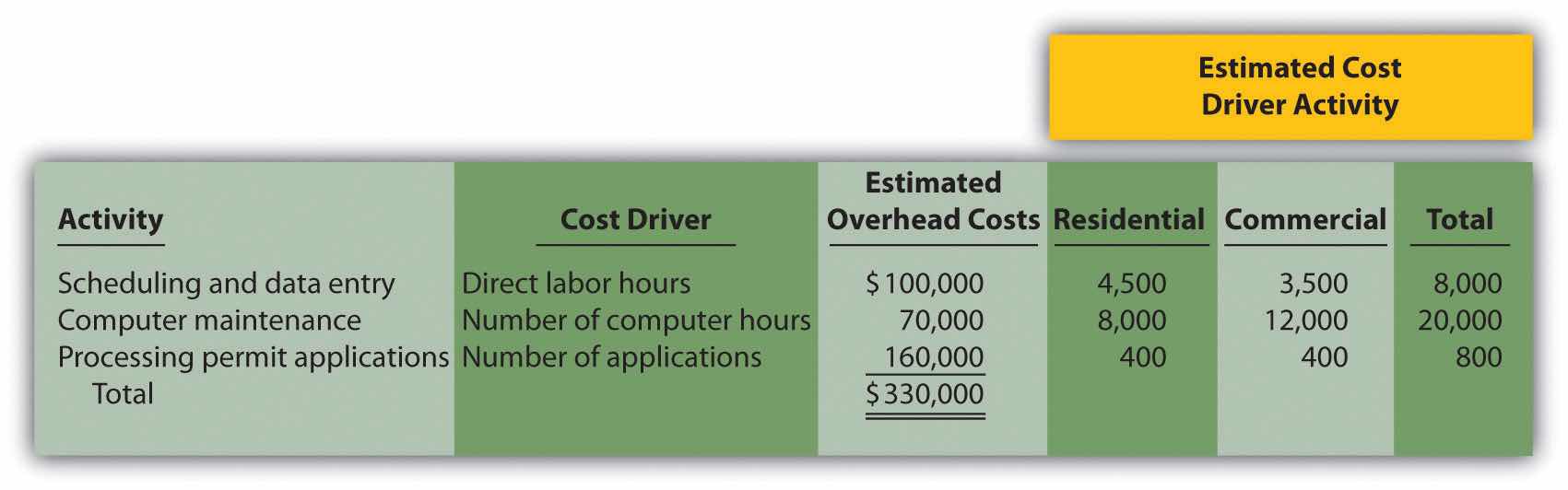 Activity-Based Costing Versus Traditional Approach: Service Company, Activity-Based Management. Hodges and Associates is a small firm that provides structural engineering services for its clients. The company performs structural engineering services for both residential and commercial buildings. Last year, total overhead costs of $330,000 were allocated based on direct labor costs. A total of $300,000 in direct labor costs were incurred in the following areas: $120,000 in the residential segment and $180,000 in the commercial segment. Direct materials used were negligible and are included in overhead costs. Sales revenue totaled $450,000 for residential services and $330,000 for commercial services.