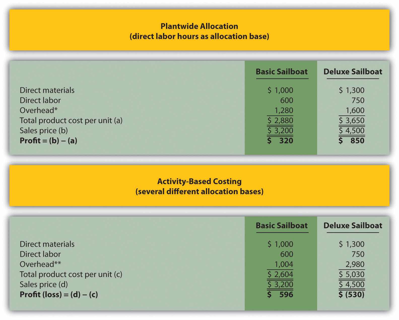 | John: | Yes, here’s what we found. The old allocation approach indicates that the Basic boat costs $2,880 to build and the Deluxe boat costs $3,650 to build. Our average sales price for the Basic is $3,200 and $4,500 for the Deluxe. You can see why we pushed sales of the Deluxe boat—it has a profit of $850 per boat. |