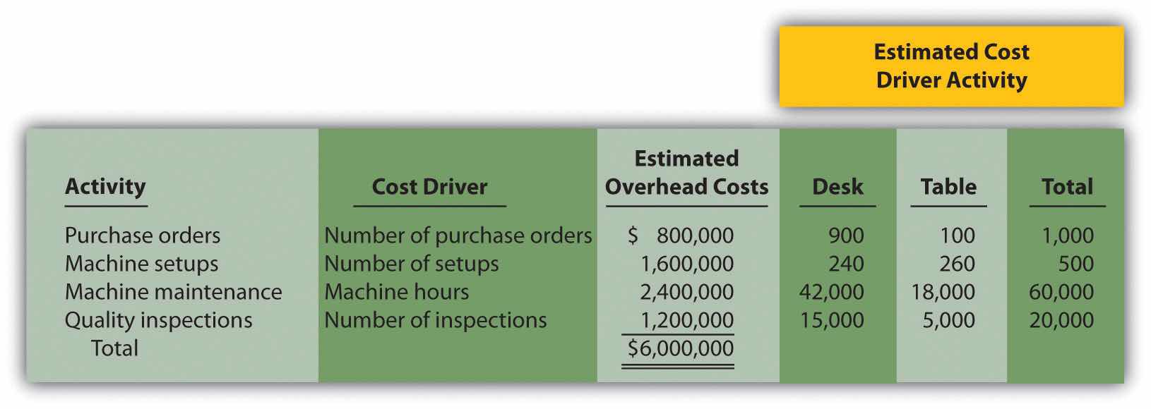 Activity-Based Costing Versus Traditional Approach, Activity-Based Management. Quality Furniture, Inc., produces a wood desk that sells for $500 and a wood table that sells for $900. Last year, total overhead costs of $6,000,000 were allocated based on direct labor costs. Direct labor costs totaled $2,000,000 last year, and Quality Furniture produced 15,000 desks and 5,000 tables. Total direct labor and direct materials costs by product for last year were as follows: