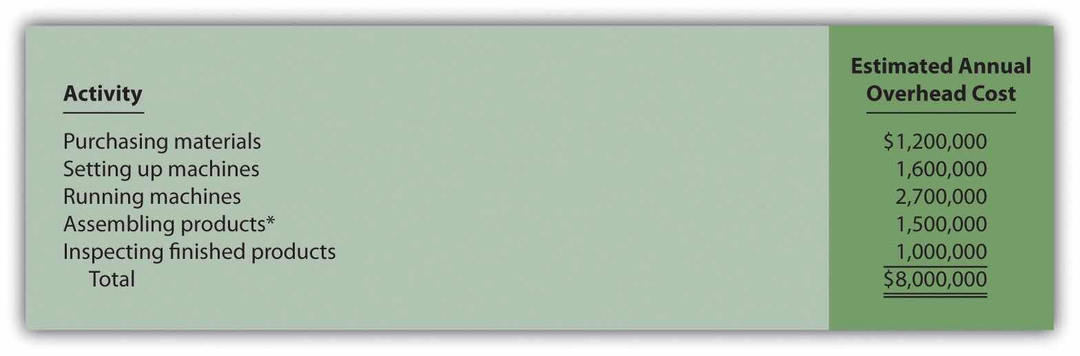 An activityAny process or procedure that consumes overhead resources. is any process or procedure that consumes overhead resources. The goal is to understand all the activities required to make the company’s products. This requires interviewing and meeting with personnel throughout the organization. Companies that use activity-based costing, such as Hewlett Packard and IBM, may identify hundreds of activities required to make their products. The most challenging part of this step is narrowing down the activities to those that have the biggest impact on overhead costs.