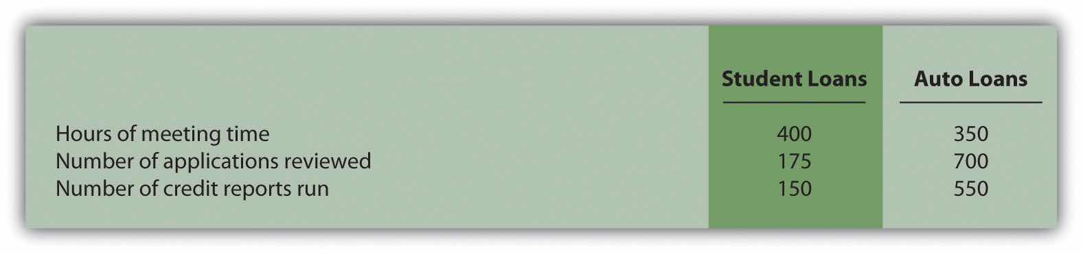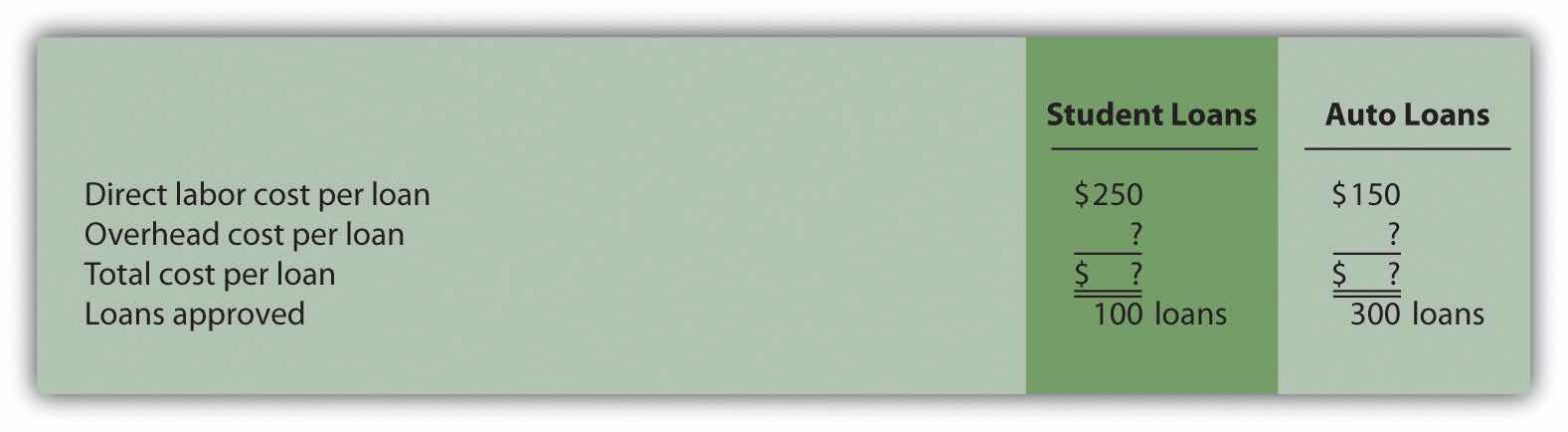 Computing Product Costs Using Activity-Based Costing, Service Company. Roseville Community Bank uses activity-based costing to assign overhead costs to two different loan products—student loans and auto loans. The bank identified the following activities, estimated costs for each activity, and identified cost drivers for each activity for this coming year. (These are the first three steps of activity-based costing.)