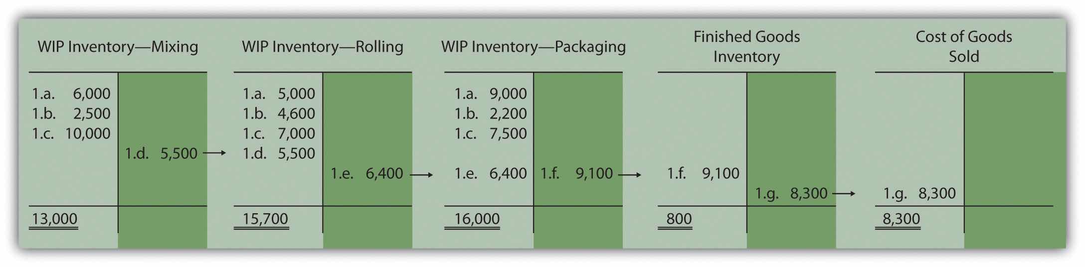 Figure 4.2 "Flow of Product Costs in a Process Costing System" summarizes the flow of product costs through T-accounts for each of the journal entries presented in this section. Note that when goods are sold and production costs are moved from finished goods inventory to cost of goods sold, an additional entry is made to record the revenue associated with this transaction. We do not show this entry because the focus of this section is on the flow of production costs rather than revenues.