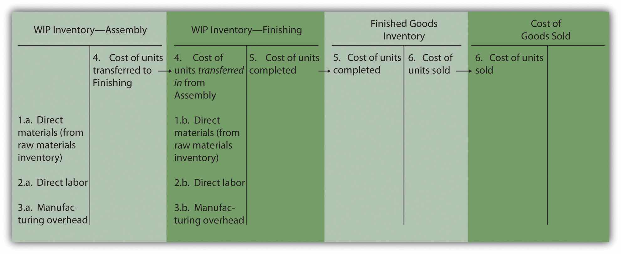 As products physically move through the production process, the product costs associated with these products move through several important accounts as shown back in Figure 4.1 "A Comparison of Cost Flows for Job Costing and Process Costing". In this section, we present a detailed look at how product costs flow through accounts using a process costing system. Later in the chapter, we explain how dollar amounts are established for product costs that flow through the accounts. As you review each of the following cost flows for a process costing system, remember that product costs are now tracked by department rather than by job.