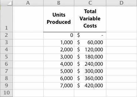 | Units Produced | Total Variable Costs | Per Unit Variable Cost |