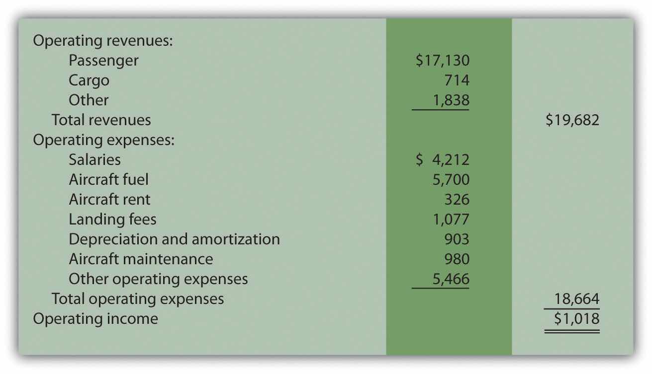 Although we cannot identify all fixed costs with certainty, several costs likely fall into this category: salaries (for union employees, such as pilots, flight crews, and mechanics); aircraft fuel (assuming flights are not easily canceled); aircraft rent; and depreciation. These costs total $11.1 billion, or 60 percent of total operating expenses (rounded). Fixed costs are clearly a large component of total operating expenses, which makes it difficult for airline companies like United Airlines to make short-term cuts in expenses when revenue declines.