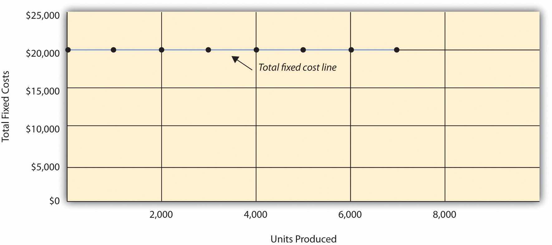 Table 5.2 "Fixed Cost Behavior for Bikes Unlimited" provides the total and per unit fixed costs at three different levels of production, and Figure 5.2 "Total Fixed Production Costs for Bikes Unlimited" graphs the relation of total fixed costs (y-axis) to units produced (x-axis). Note that regardless of the activity level, total fixed costs remain the same.
