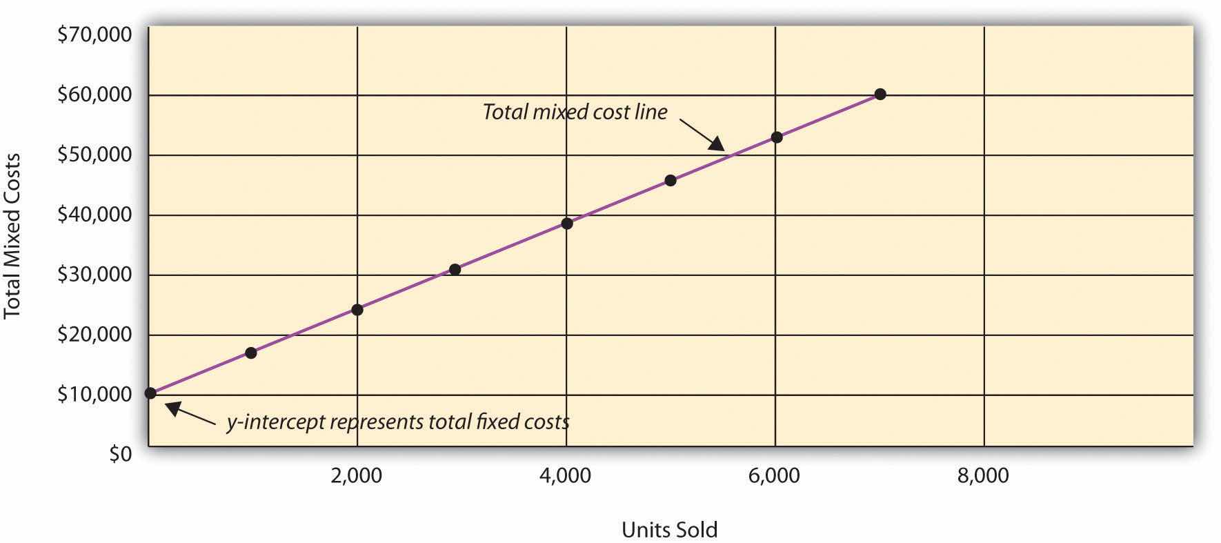 Table 5.3 "Mixed Cost Behavior for Bikes Unlimited" provides the total and per unit fixed costs at three different levels of production, and Figure 5.3 "Total Mixed Sales Compensation Costs for Bikes Unlimited" graphs the relation of total mixed costs (y-axis) to units produced (x-axis). The point at which the line intersects the y-axis represents the total fixed cost ($10,000), and the slope of the line represents the variable cost per unit ($7).