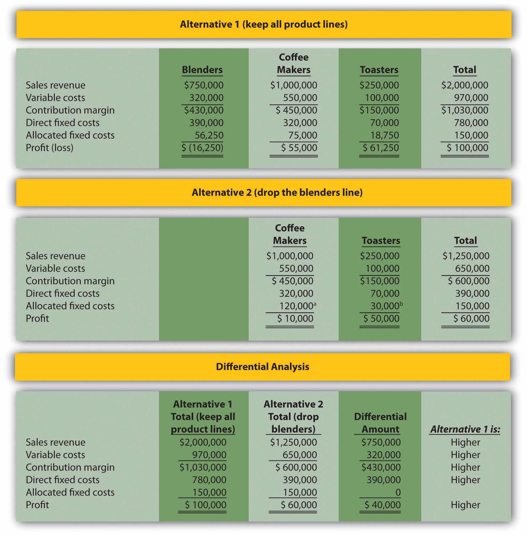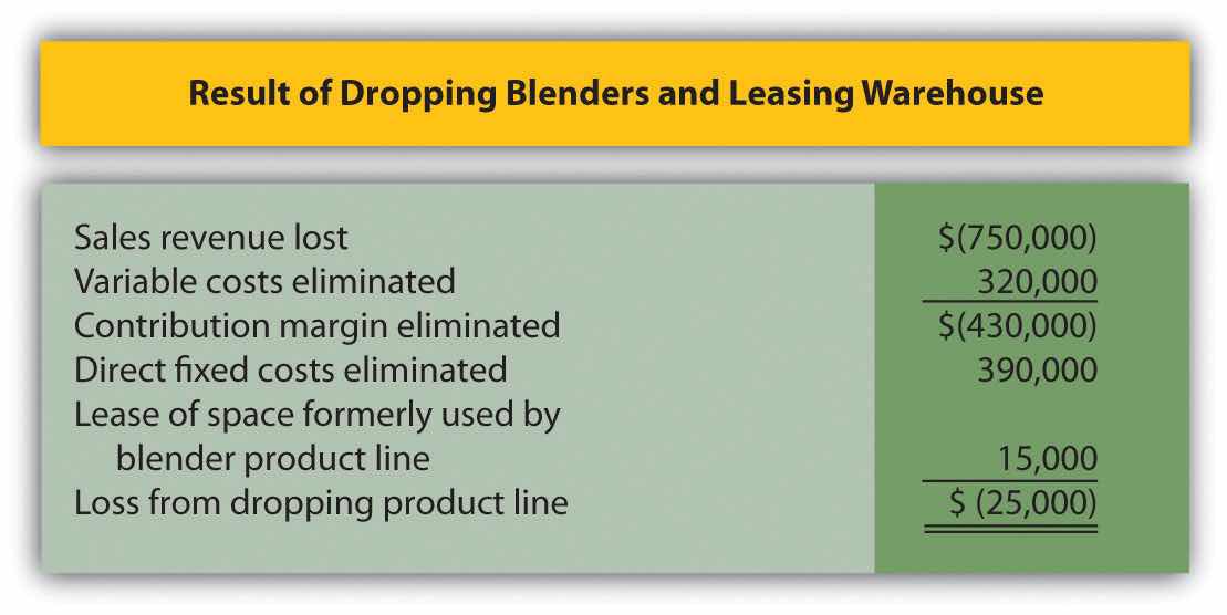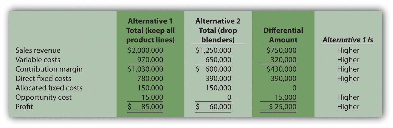 The $15,000 opportunity cost of keeping all three product lines would not affect the company’s decision to keep the blenders product line. If the blenders are dropped, total profit will decrease by $40,000. Lease revenue of $15,000 is not enough to offset the $40,000 decrease in profit. In this scenario, total profit would decrease by $25,000 (= $40,000 − $15,000). This result is presented formally, as follows: