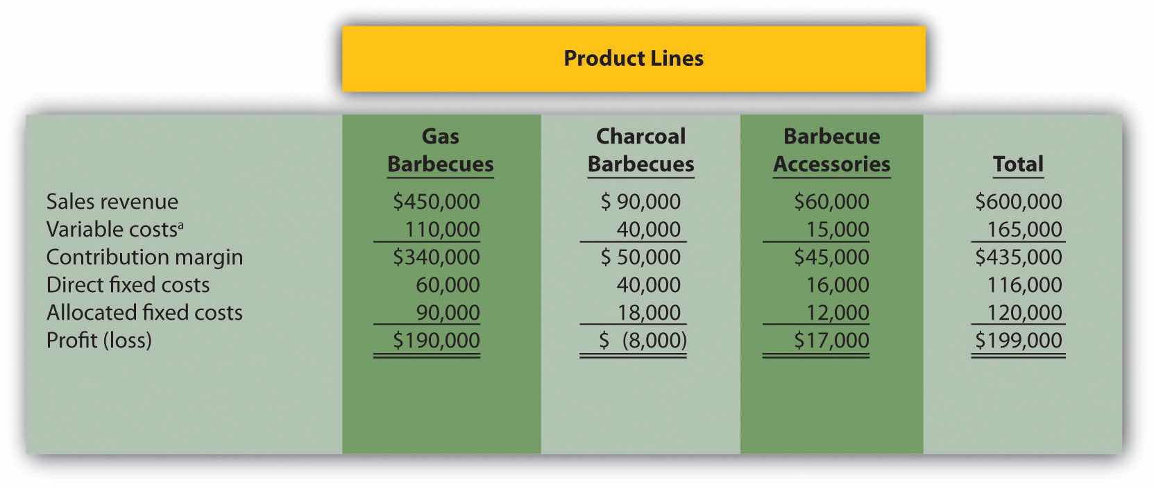 Figure 7.5 "Income Statement for Barbeque Company" presents the income statement for the past year, separated by product line (this is often referred to as a segmented income statement). Carefully examine Figure 7.5 "Income Statement for Barbeque Company". Notice that the charcoal barbecues product line shows a loss of $8,000 for the year. This is the reason management would like to consider dropping this product line.