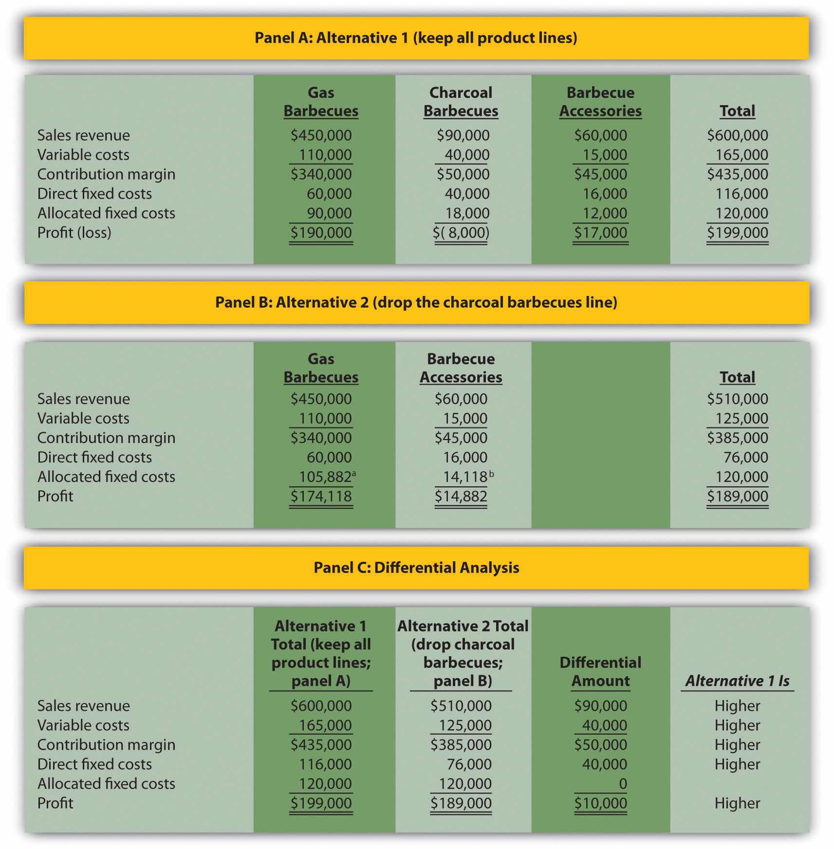 The variable costs in Figure 7.5 "Income Statement for Barbeque Company" are related directly to each product line, and thus are eliminated if the product line is eliminated. That is, all variable costs are differential costs for the two alternatives facing Barbeque Company.