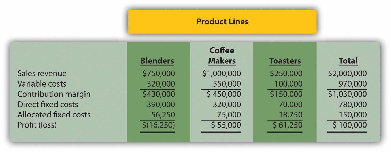 Austin Appliances is concerned about the losses associated with the blenders product line and is considering dropping this product line. Allocated fixed costs are assigned to product lines based on sales. For example, $56,250 in allocated fixed costs is allocated to the blenders product line based on the blenders product line sales as a percent of total sales [$56,250 = $150,000 × ($750,000 ÷ $2,000,000)]. If Austin Appliances eliminates a product line, total allocated fixed costs are assigned to the remaining product lines. All variable costs and direct fixed costs are differential costs.