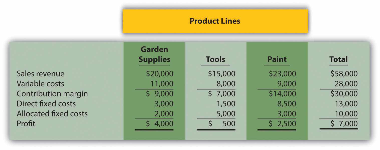 Management is concerned about the low profit associated with the tools product line and is considering dropping this product line. Allocated fixed costs are assigned to product lines based on floor space used by each product line (measured in square feet), resulting in the following percentages for garden supplies, tools, and paint, respectively: 20 percent, 50 percent, and 30 percent. If the tools product line is eliminated, total allocated fixed costs will be assigned as follows: 62.5 percent to garden supplies, and 37.5 percent to paint. All variable and direct fixed costs for the tools product line will be eliminated.