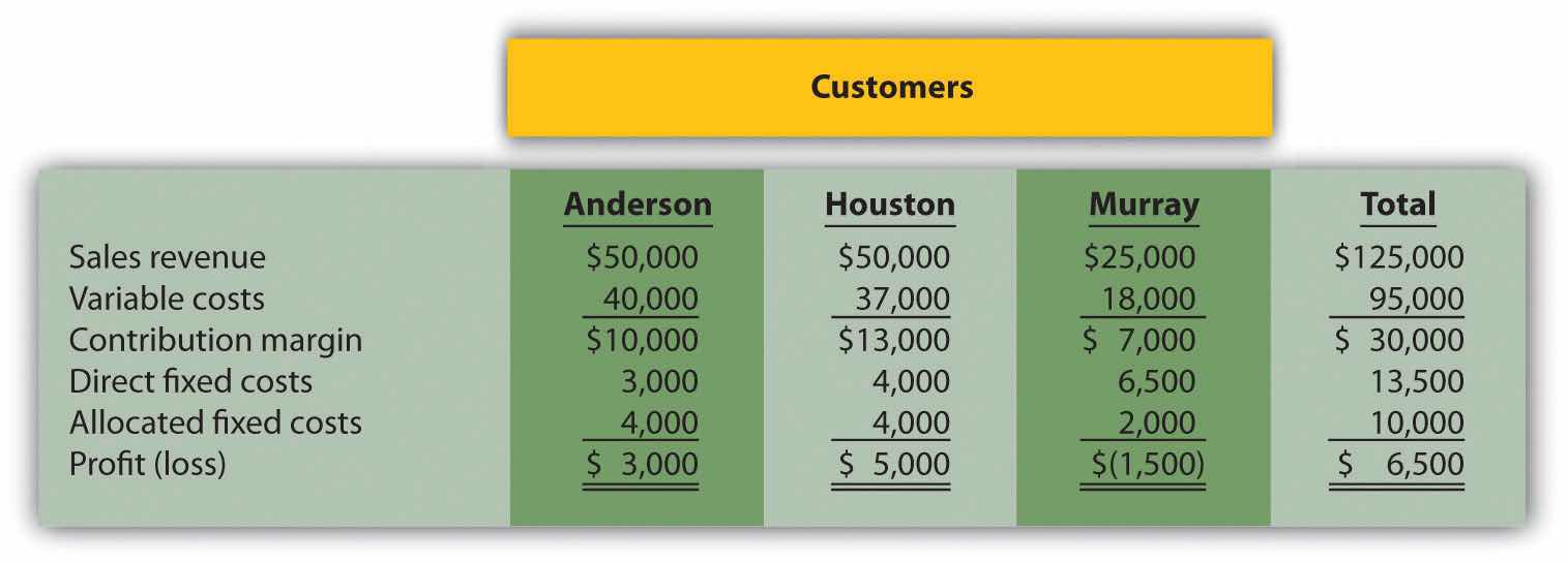 Management is concerned about the losses associated with the Murray account and would like to drop this customer. Allocated fixed costs are assigned to customers based on sales revenue. If Murray is dropped, total allocated fixed costs are assigned to the remaining customers, and all variable and direct fixed costs for the Murray account will be eliminated.