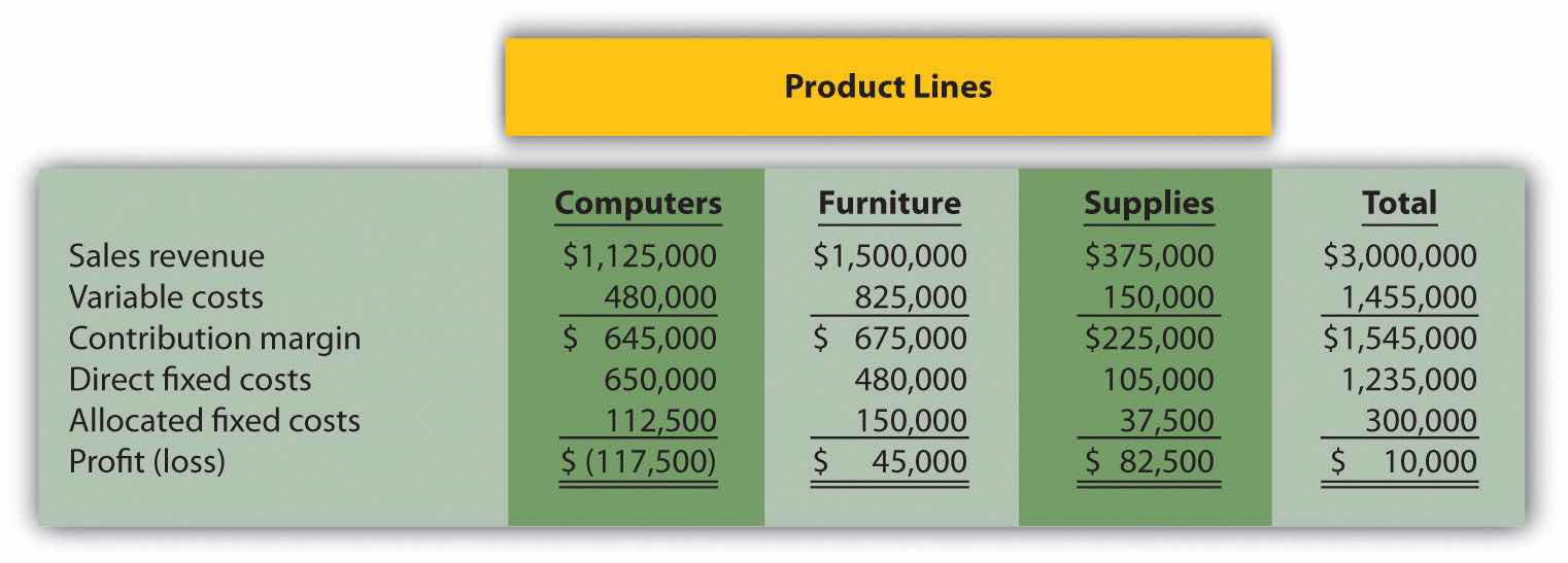 Management is concerned about the significant losses associated with the computers product line and would like to drop this product line. Allocated fixed costs are assigned to product lines based on sales. If the computers product line is eliminated, total allocated fixed costs are assigned to the remaining product lines, and all variable and direct fixed costs for the computers product line will be eliminated.