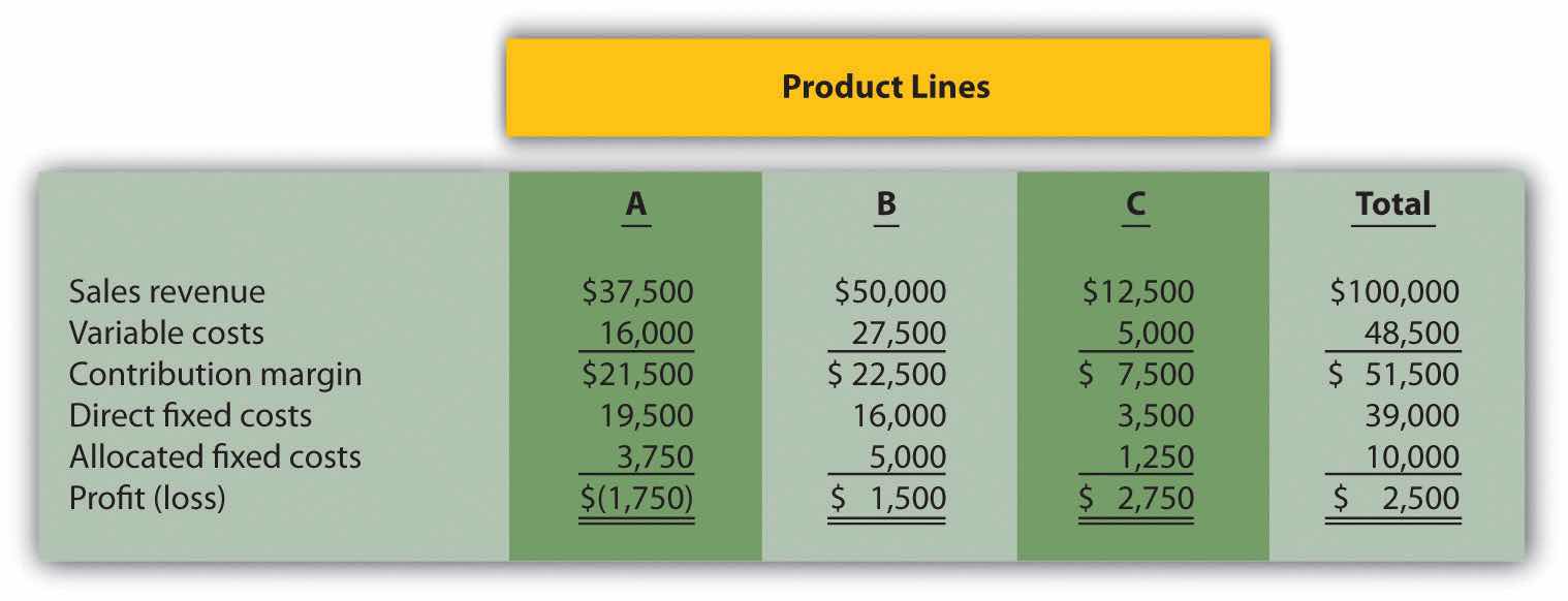 Management is concerned about the losses associated with product line A and is considering dropping this product line. Allocated fixed costs are assigned to product lines based on sales. If product line A is eliminated, total allocated fixed costs are assigned to the remaining product lines, and all variable and direct fixed costs for product line A will be eliminated.