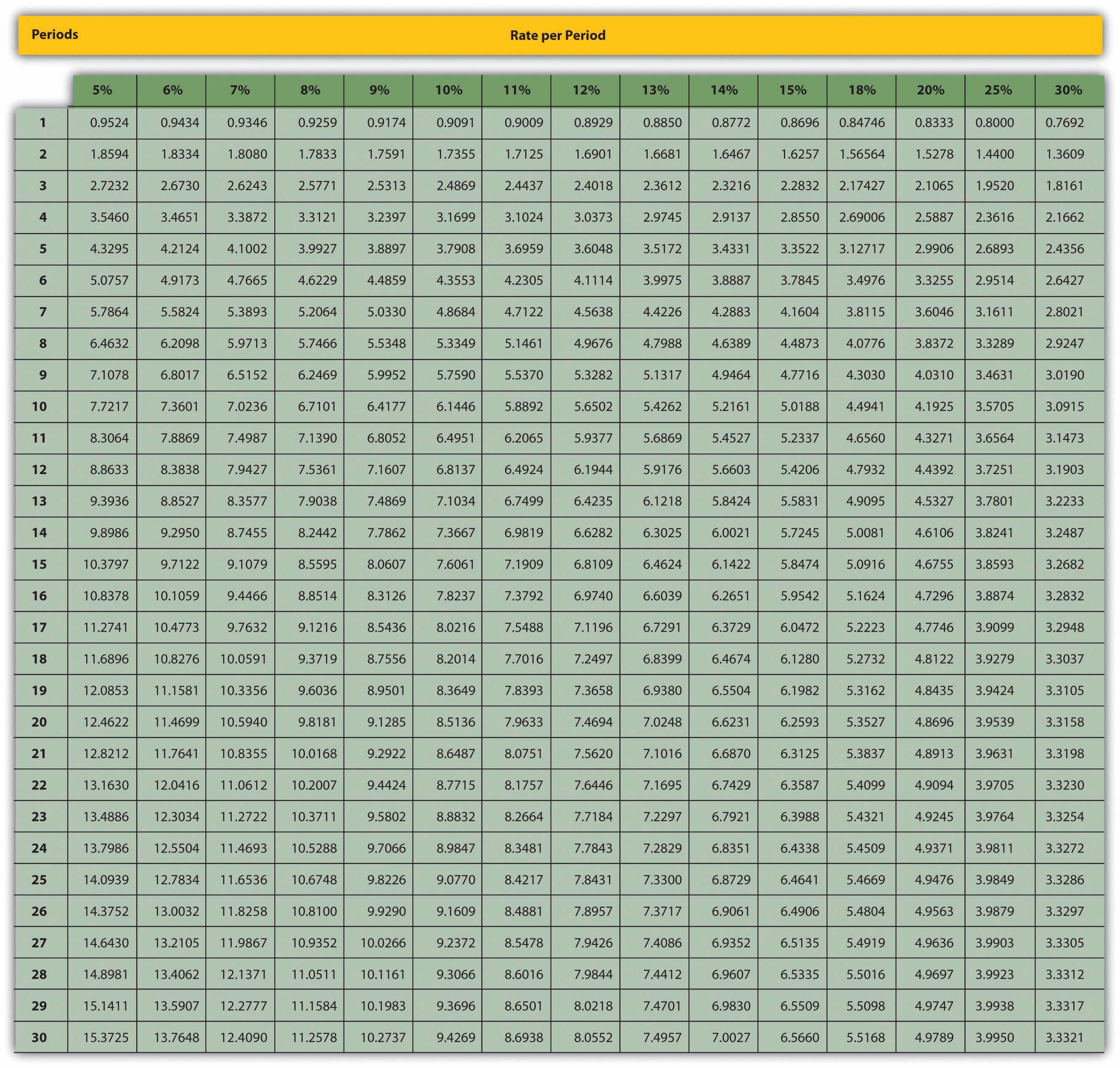 Present Value Calculations (Annuities). For each of the following independent scenarios, use Figure 8.10 "Present Value of a $1 Annuity Received at the End of Each Period for " in the appendix to calculate the present value of the cash flow described. Round to the nearest dollar.