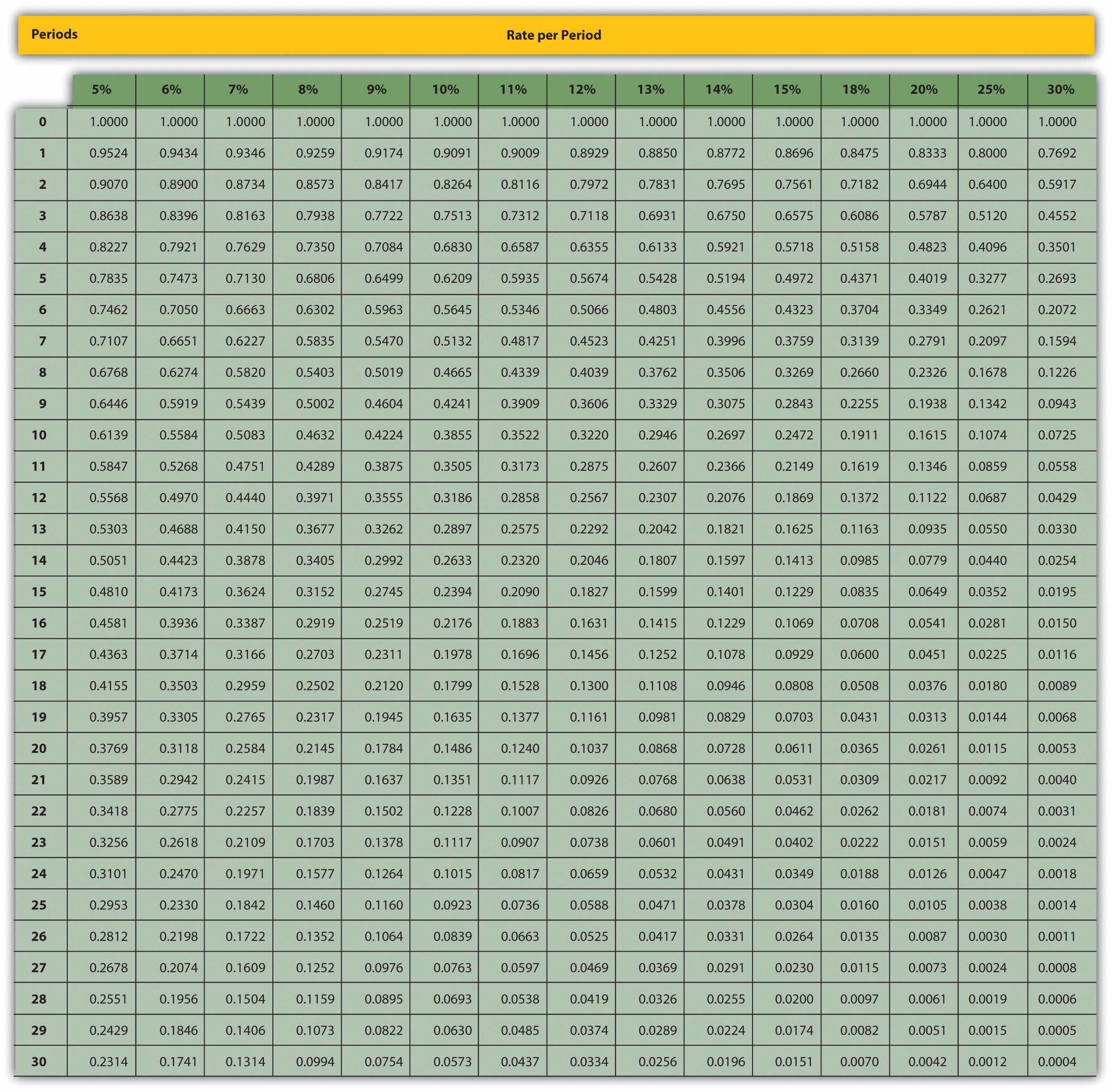 Present Value Calculations. For each of the following independent scenarios, use Figure 8.9 "Present Value of $1 Received at the End of " in the appendix to calculate the present value of the cash flow described.