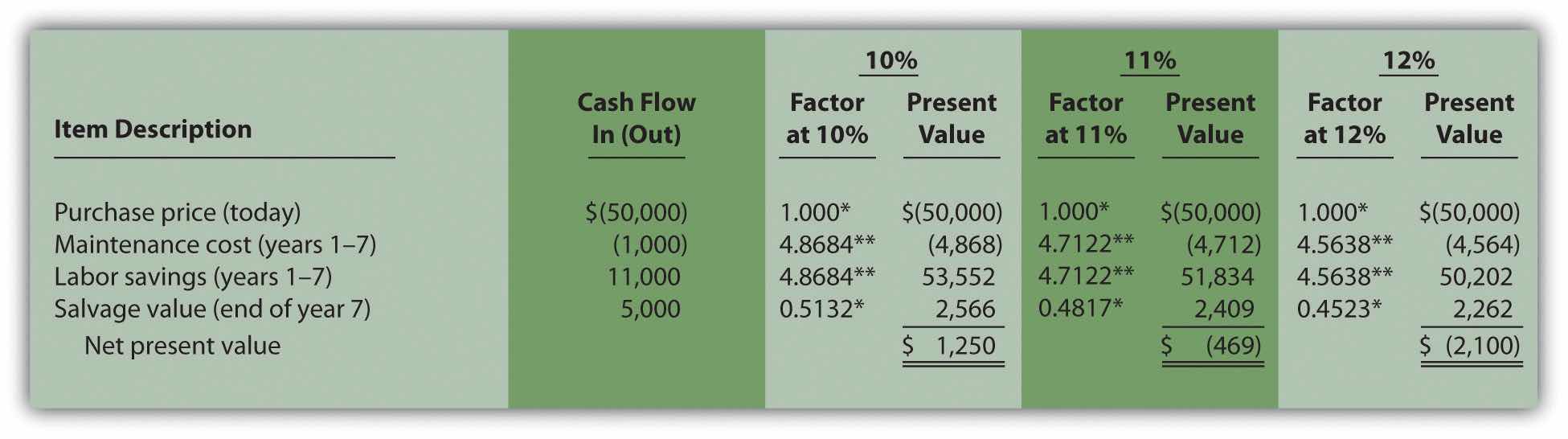 The purchase price and salvage value rows in Figure 8.4 "Alternative NPV Calculation for Jackson’s Quality Copies" represent one-time cash flows, and thus we use Figure 8.9 "Present Value of $1 Received at the End of " in the appendix to find the present value factor for these items (these are not annuities). The annual maintenance costs and annual labor savings rows represent cash flows that occur each year for seven years (these are annuities). We use Figure 8.10 "Present Value of a $1 Annuity Received at the End of Each Period for " in the appendix to find the present value factor for these items (note that the number of years, n, equals seven since the cash flows occur each year for seven years). Simply multiply the cash flow shown in column (A) by the present value factor shown in column (B) to find the present value for each line item. Then sum the present value column to find the NPV. This alternative approach results in the same NPV shown in Figure 8.2 "NPV Calculation for Copy Machine Investment by Jackson’s Quality Copies".