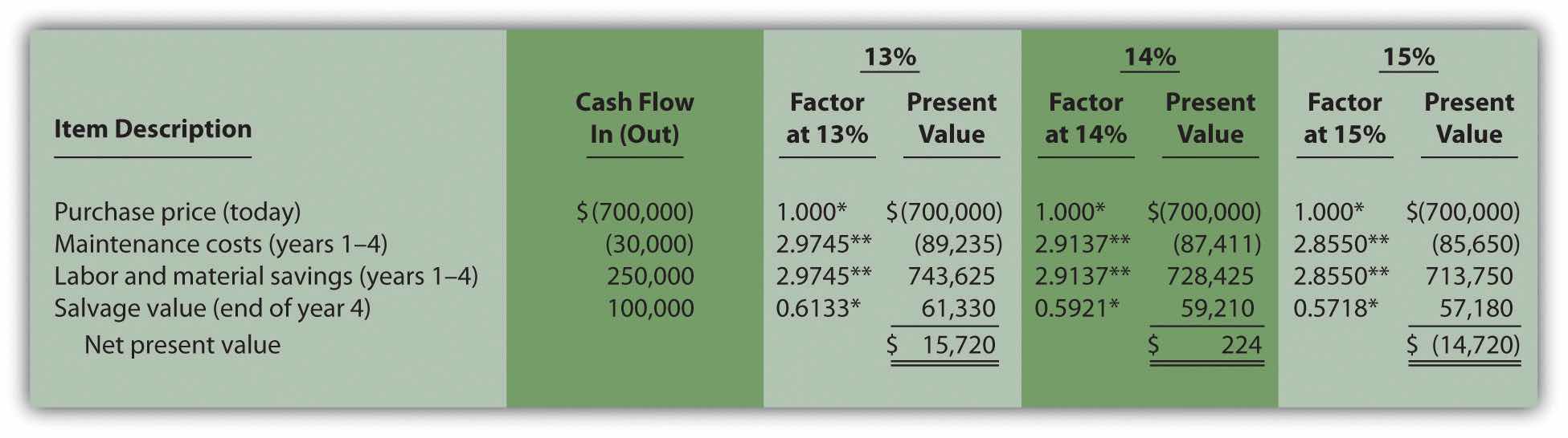 Internal Rate of Return Analysis. Architect Services, Inc., would like to purchase a blueprint machine for $50,000. The machine is expected to have a life of 4 years, and a salvage value of $10,000. Annual maintenance costs will total $14,000. Annual savings are predicted to be $30,000. The company’s required rate of return is 11 percent (this is the same data as the previous exercise).