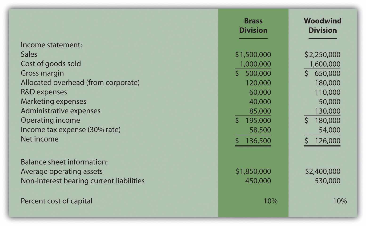 Research and development will be capitalized and amortized over several years resulting in an increase to average operating assets of $40,000 for the Brass division and $80,000 for the Woodwind division. On the income statement, R&D expenses for the year will be added back to operating income; R&D amortization expense for one year will be deducted. The current year amortization expense will total $20,000 for the Brass division and $30,000 for the Woodwind division.
