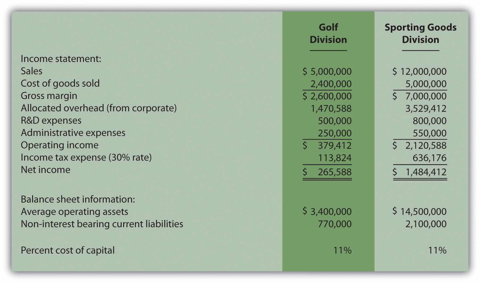 Research and development will be capitalized and amortized over several years resulting in an increase to average operating assets of $400,000 for the Golf division and $650,000 for the Sporting Goods division. On the income statement, R&D expense for the year will be added back to operating income; then R&D amortization expense for one year will be deducted. The current year amortization expense will total $100,000 for the Golf division and $150,000 for the Sporting Goods division.